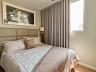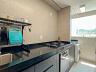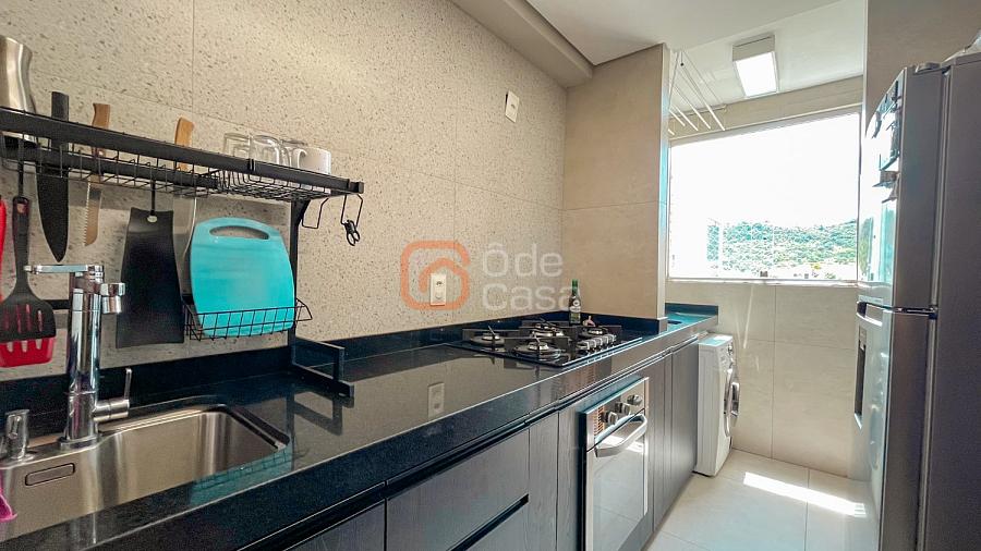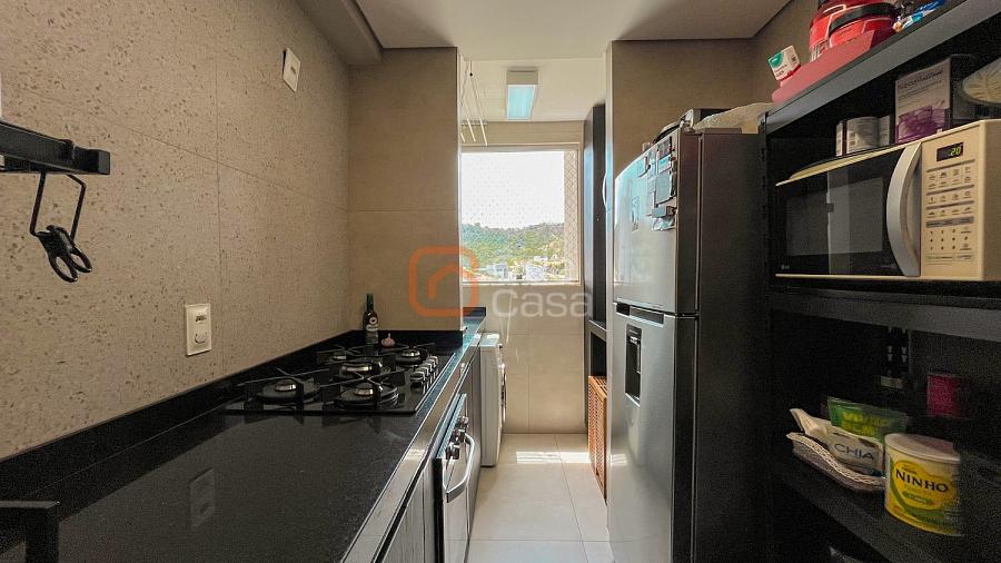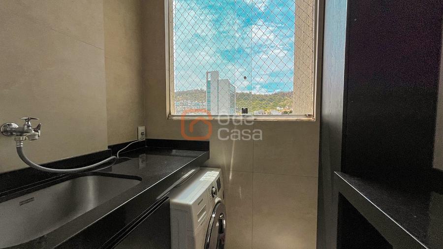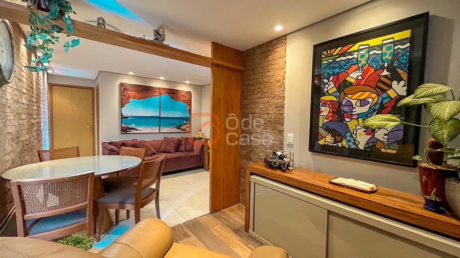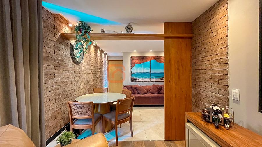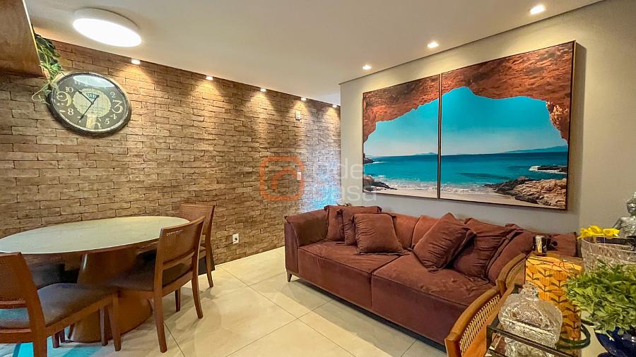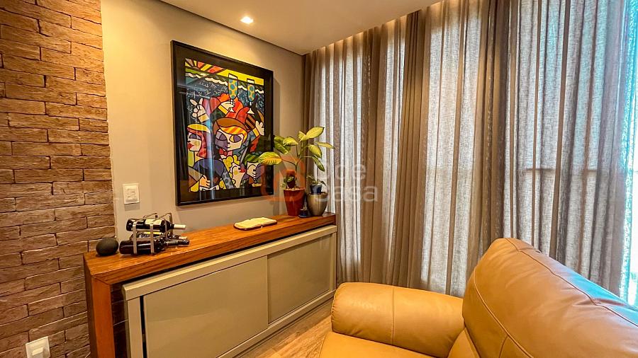 Sala para dois ambientes com varanda integrada, cozinha com armários, área de serviço independente, 3 quartos, sendo 1 suíte, dois deles com armários planejados, e banheiro social.