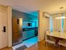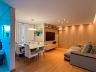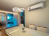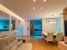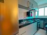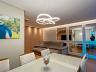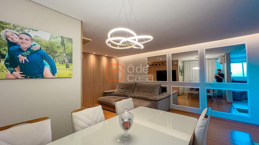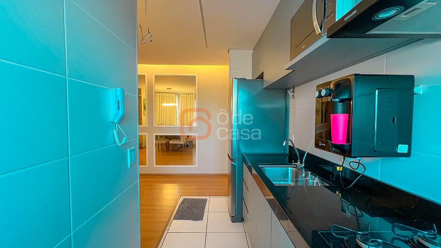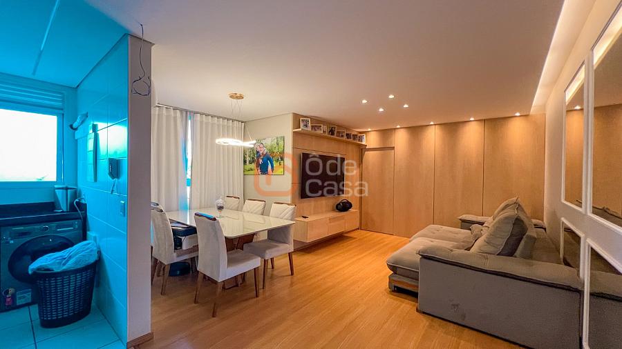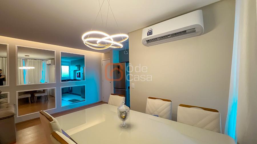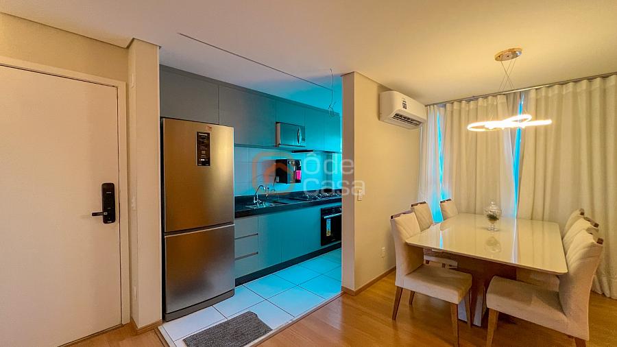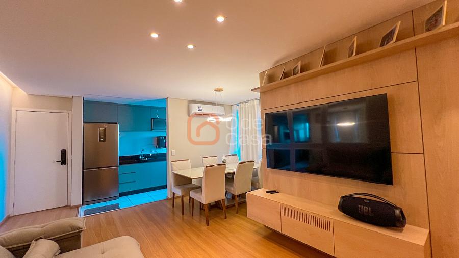 Sala para dois ambientes com painel de TV, sofá, mesa para 6 lugares e ar-condicionado, cozinha com cooktop, forno, coifa, purificador de água, geladeira, microondas e área de serviço com lava e seca.