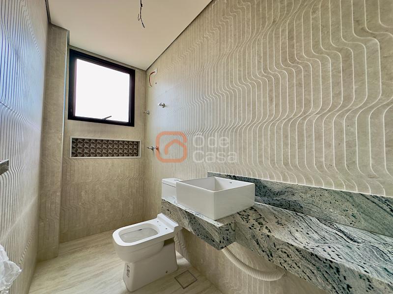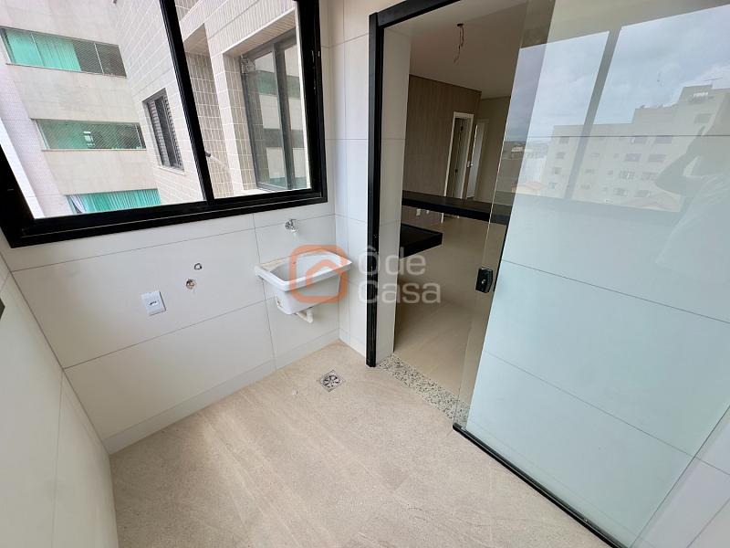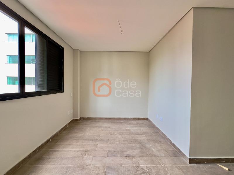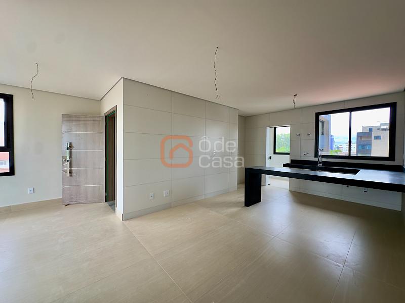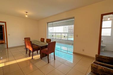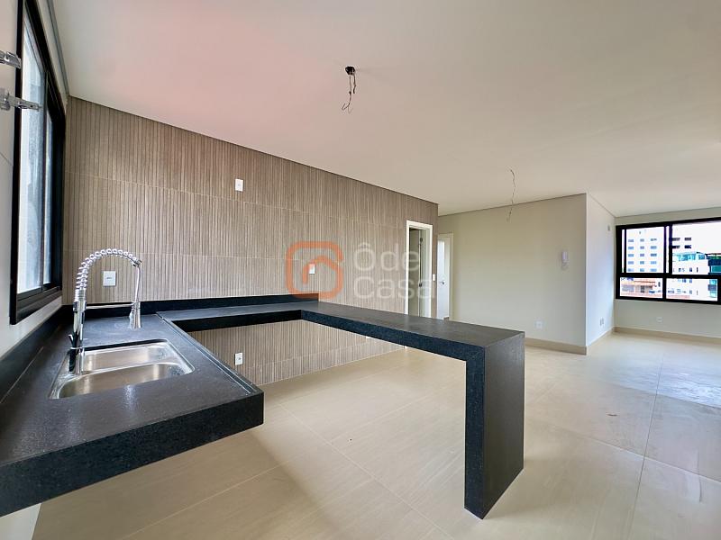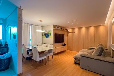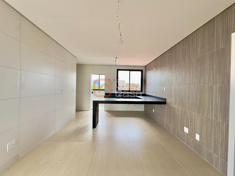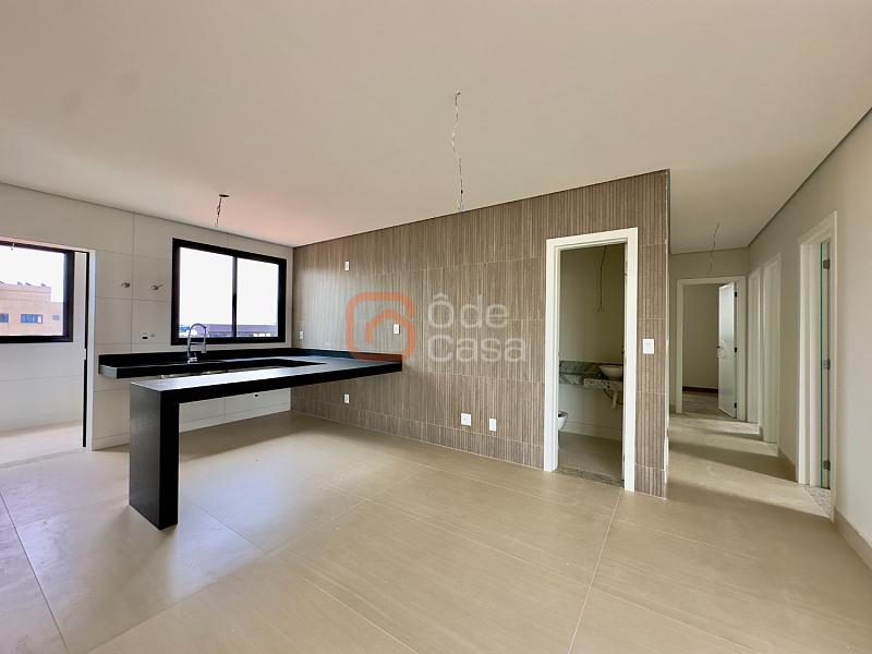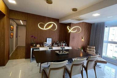 Apartamento de 105m² com sala para dois ambientes integrada à cozinha americana, lavabo, área de serviço separada, quatro quartos sendo uma suíte e um banheiro social.