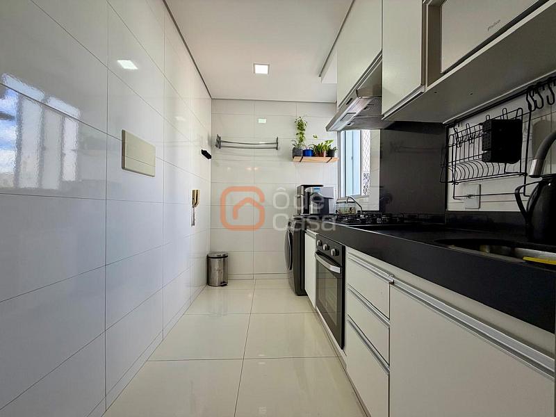 Sala para dois ambientes, cozinha com bancadas em granito, conjugada com área de serviço, 2 quartos e banheiro social.