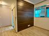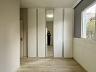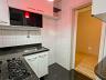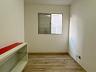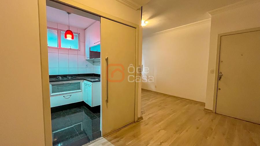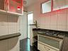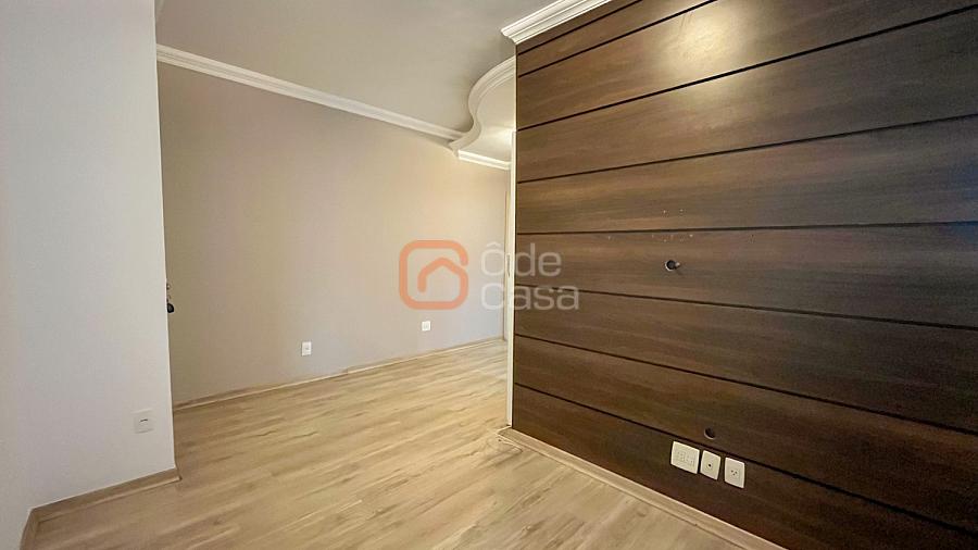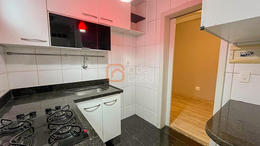 Sala para dois ambientes com painel de TV, cozinha com armários e cooktop, 2 quartos, sendo 1 com armário planejado e saída para área externa e banheiro social.