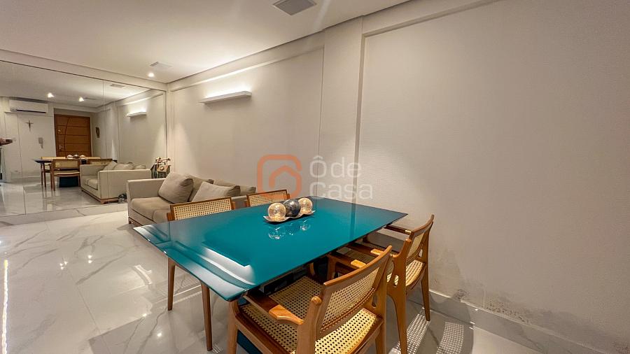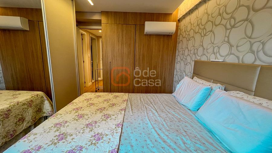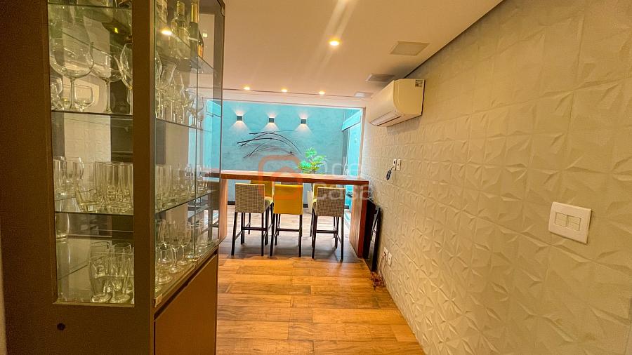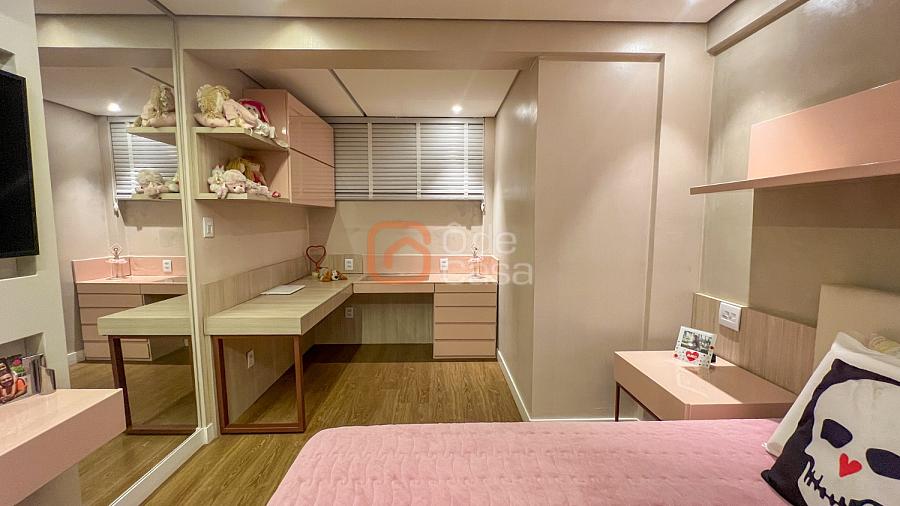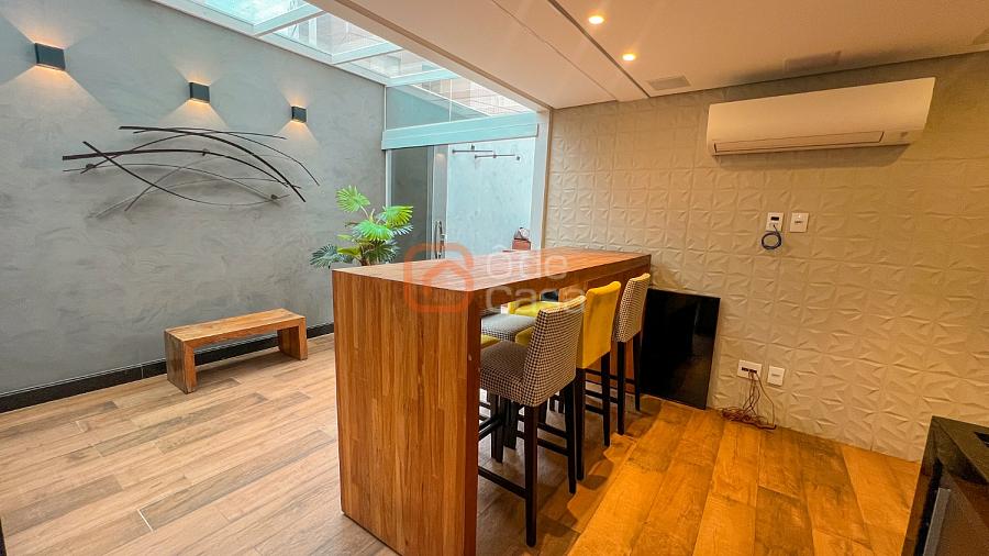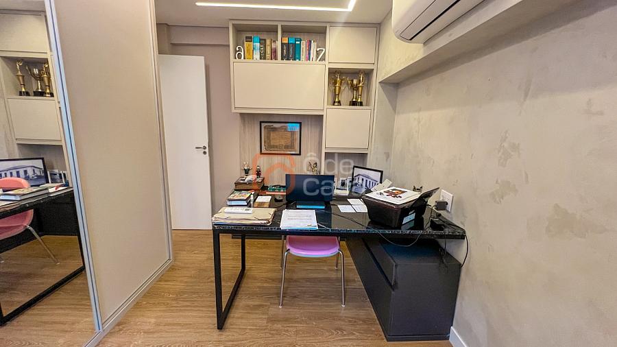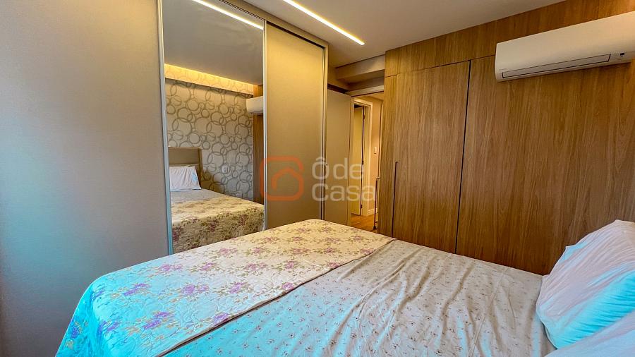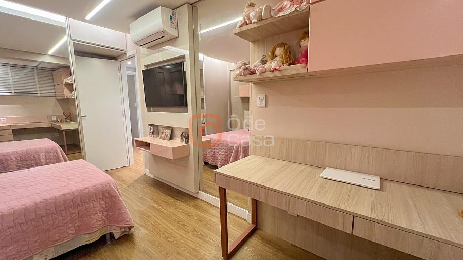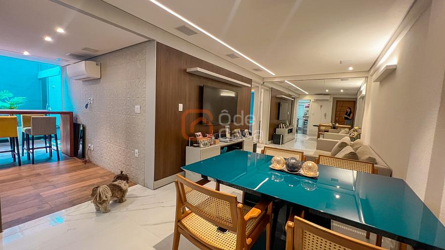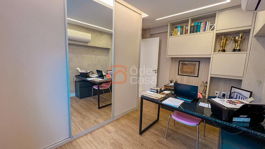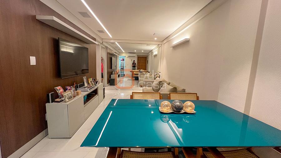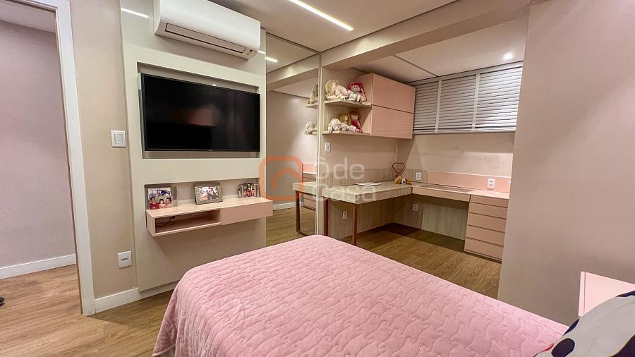 Sala ampla para 2 ambientes, piso em porcelanato, rebaixamento em gesso, projeto luminotécnico, sistema acústico e ar-condicionado, cozinha ampla com armários planejados; 3 quartos com armários planejados, sendo 1 suíte, todos os quartos possuem ar-condicionado climatizados. 1 banho social com armário, box e espelho.