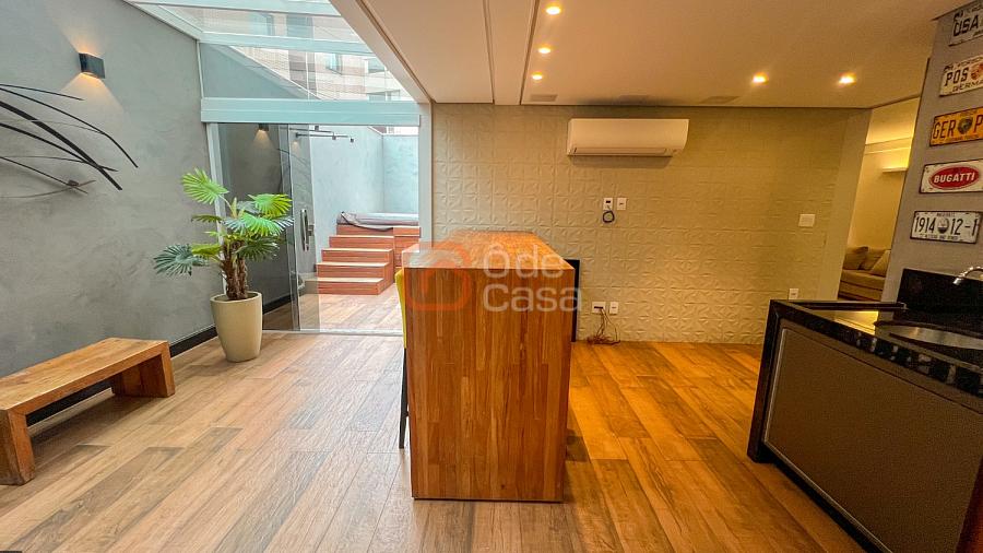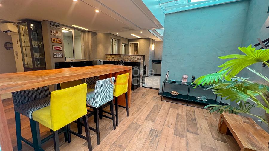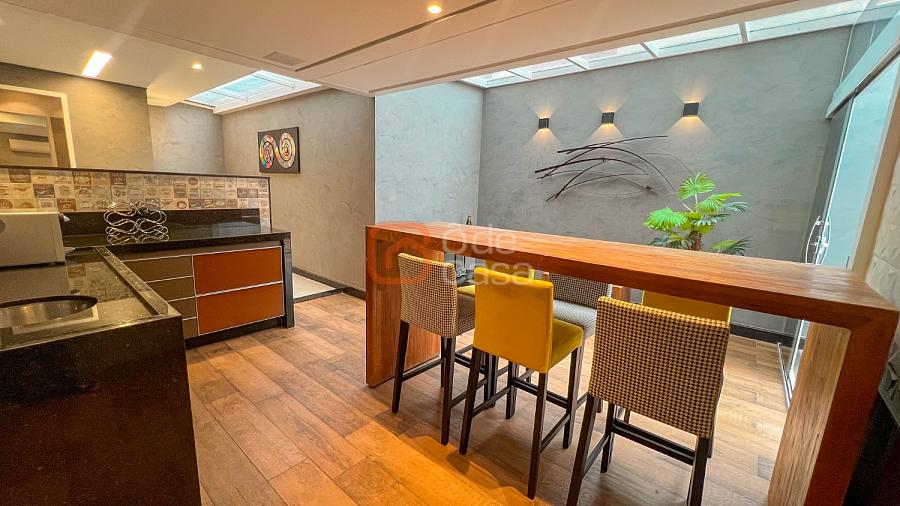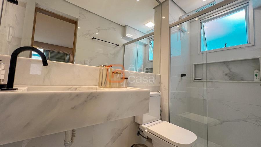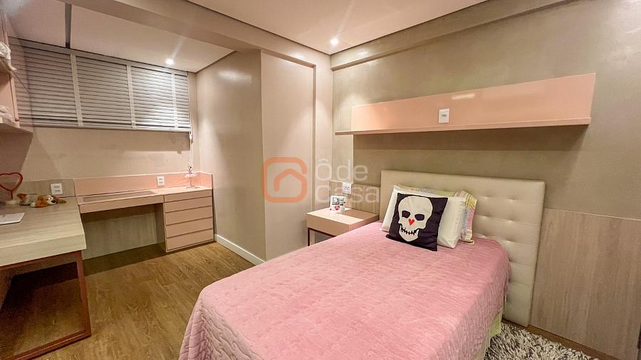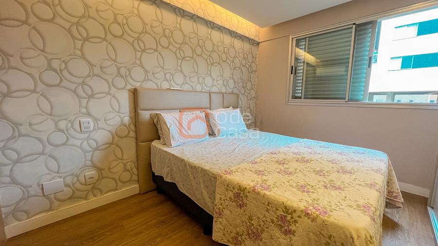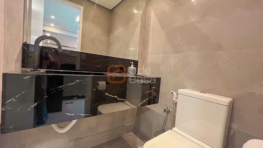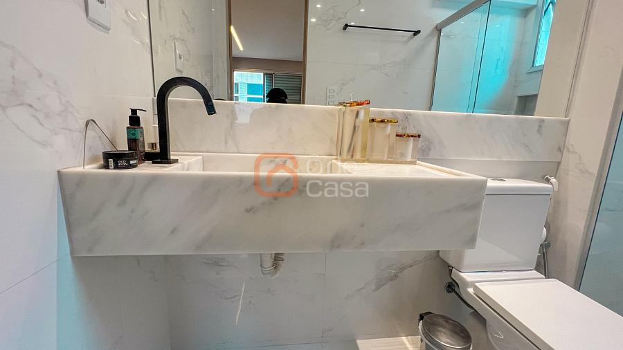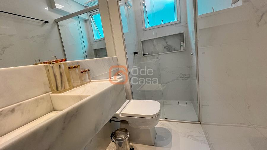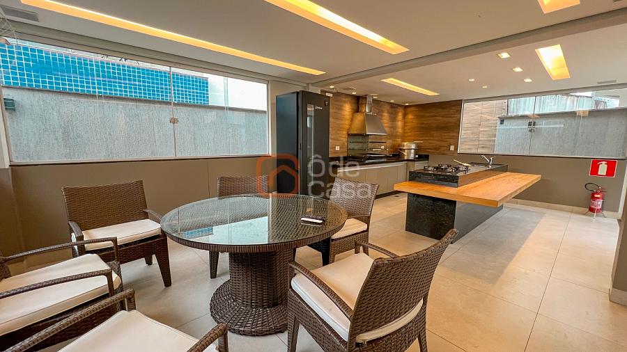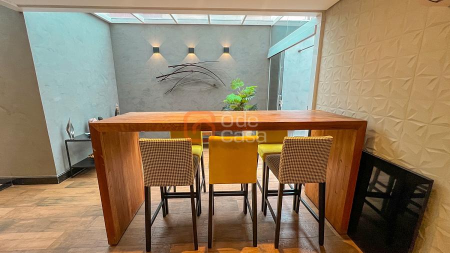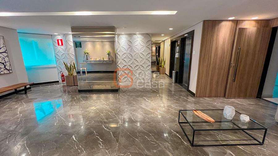 Sala ampla para 2 ambientes, piso em porcelanato, rebaixamento em gesso, projeto luminotécnico, sistema acústico e ar-condicionado, cozinha ampla com armários planejados; 3 quartos com armários planejados, sendo 1 suíte, todos os quartos possuem ar-condicionado climatizados. 1 banho social com armário, box e espelho.