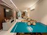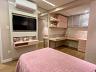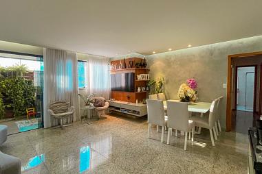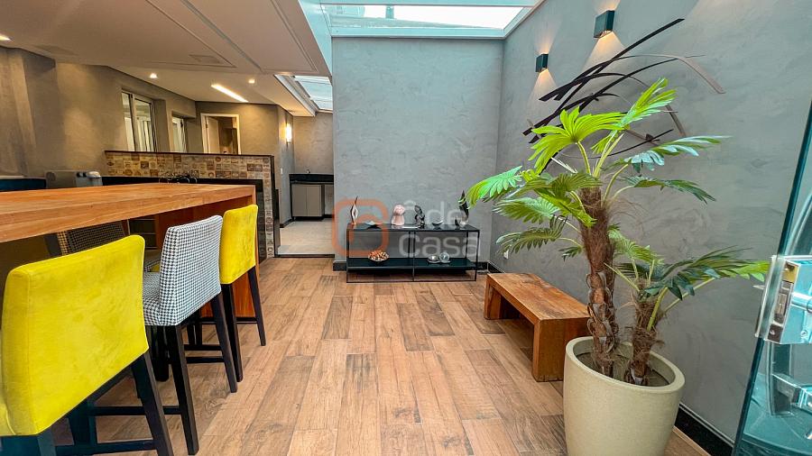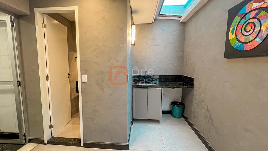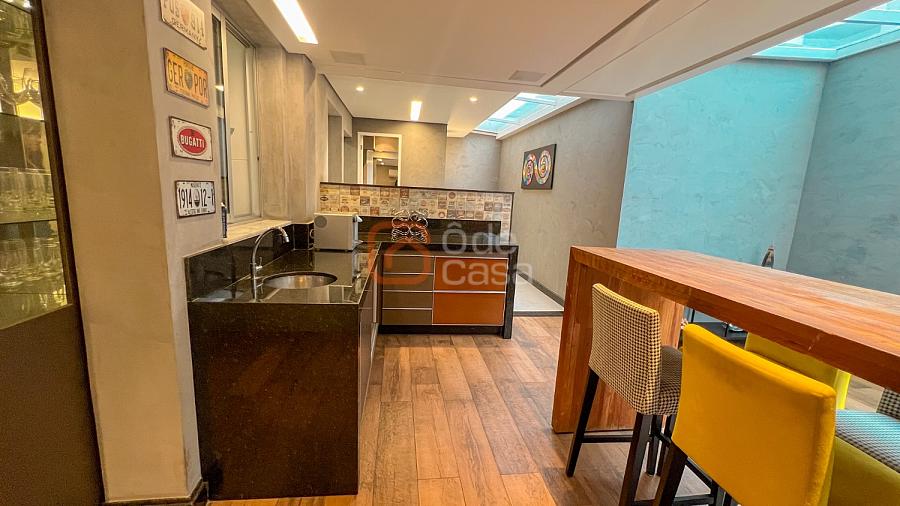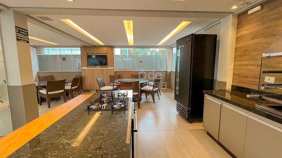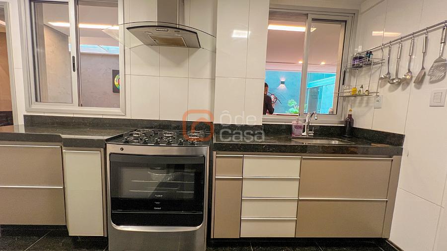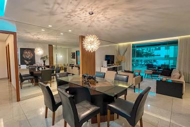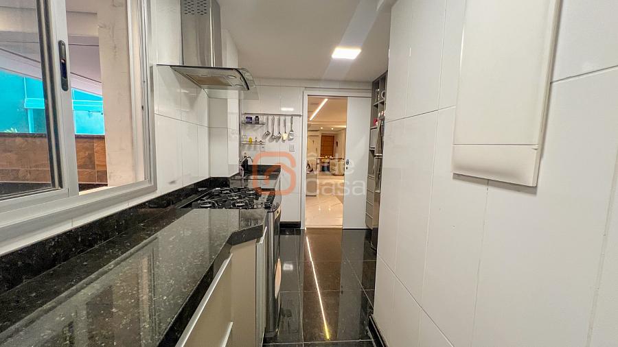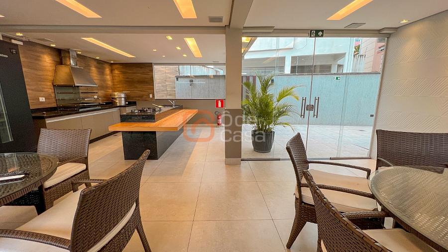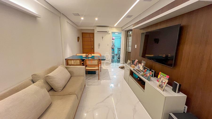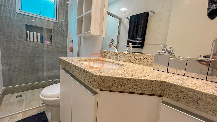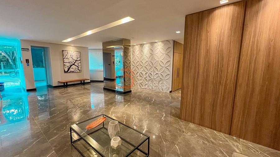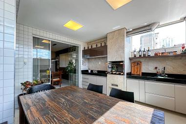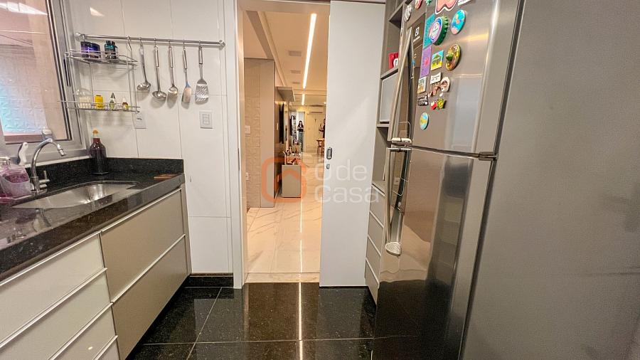 Sala ampla para 2 ambientes, piso em porcelanato, rebaixamento em gesso, projeto luminotécnico, sistema acústico e ar-condicionado, cozinha ampla com armários planejados; 3 quartos com armários planejados, sendo 1 suíte, todos os quartos possuem ar-condicionado climatizados. 1 banho social com armário, box e espelho.