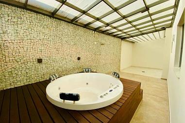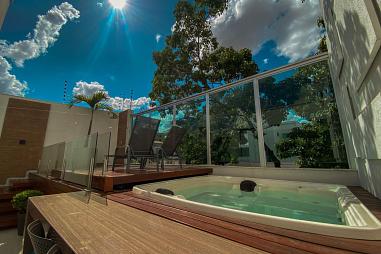 Área externa coberta, com área de serviço, um lavabo, área gourmet com bancadas, ar-condicionado e um deck com jacuzzi