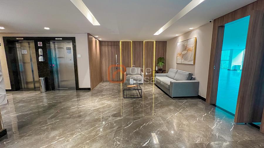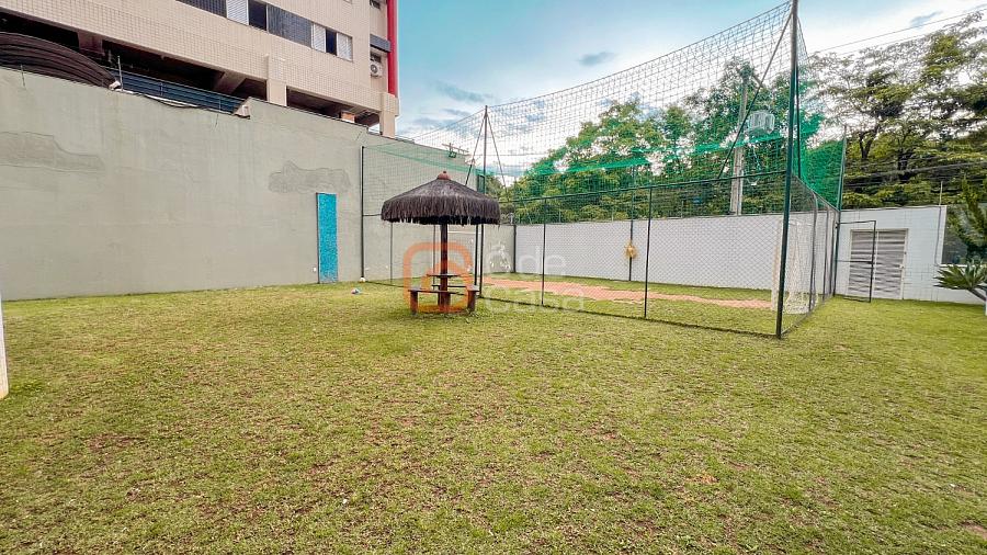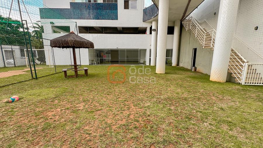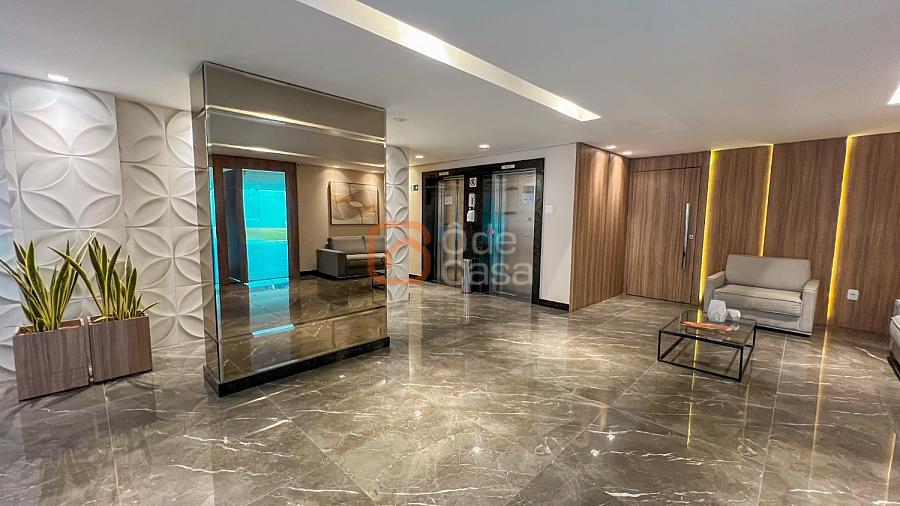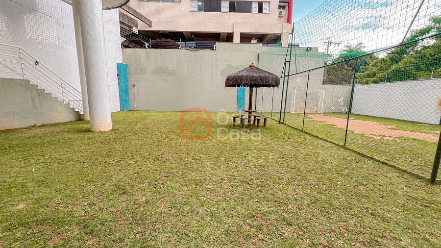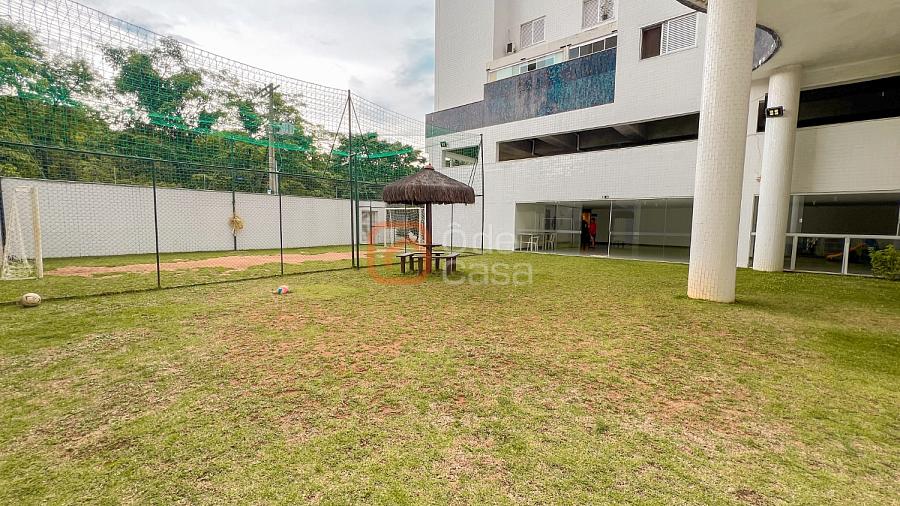 Prédio com fachada imponente, revestido, hall social decorado, elevador, salão de festas, espaço gourmet com piscina e campinho gramado.