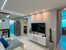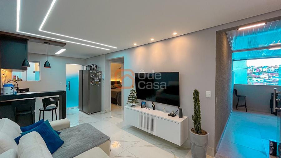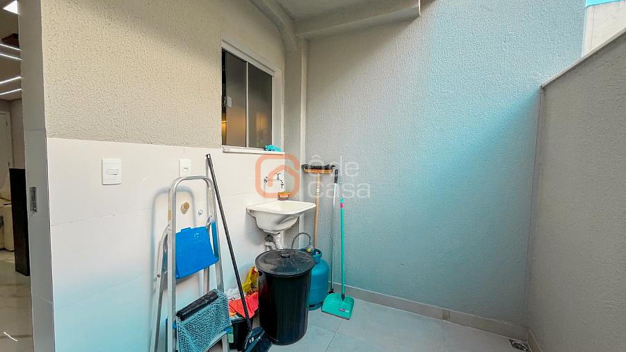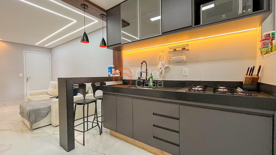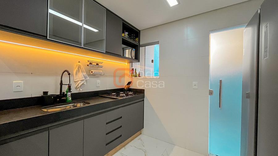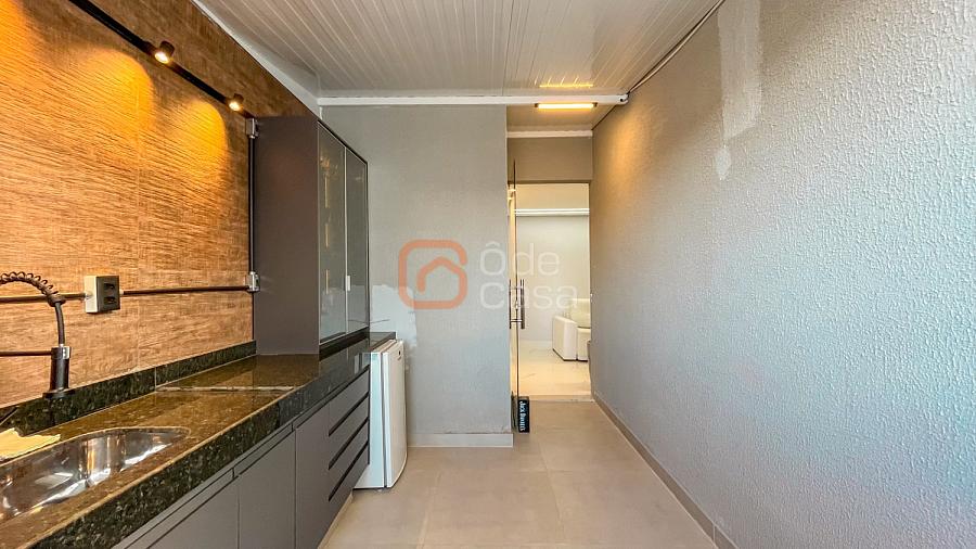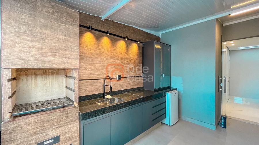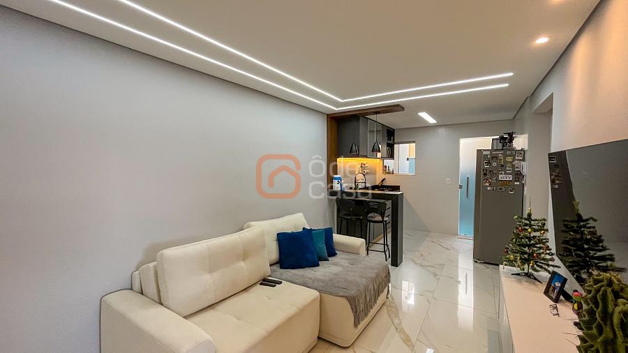 Ampla sala de TV conjugada com cozinha americana com armários, área gourmet coberta com churrasqueira, área de serviço, 2 quartos e banheiro social.