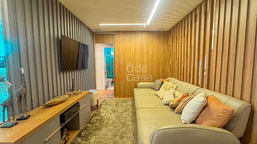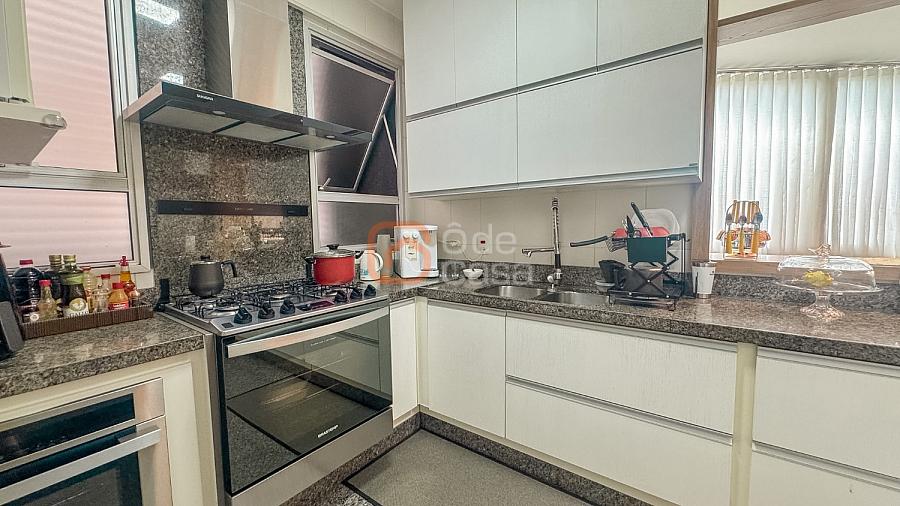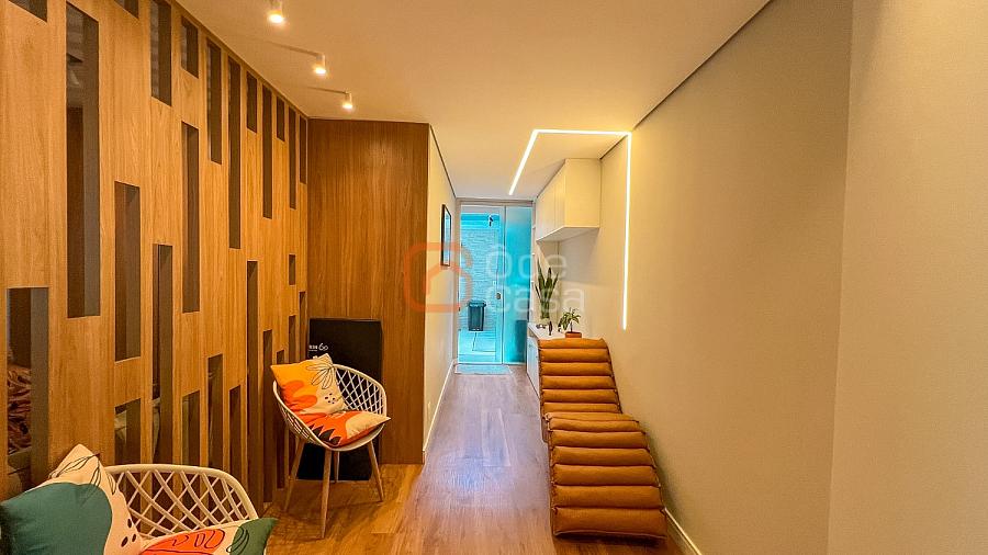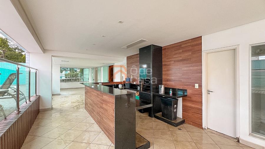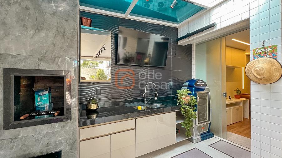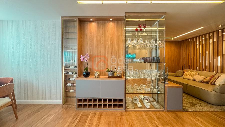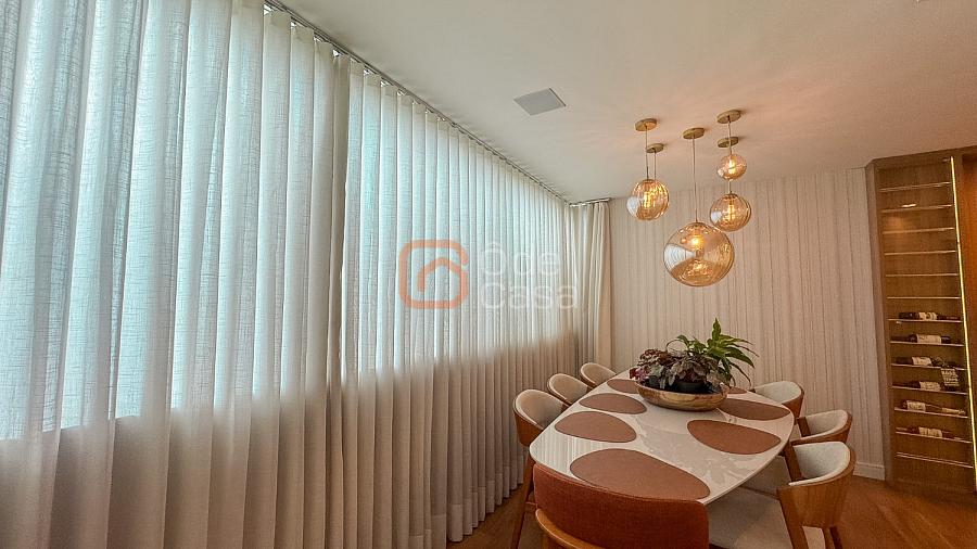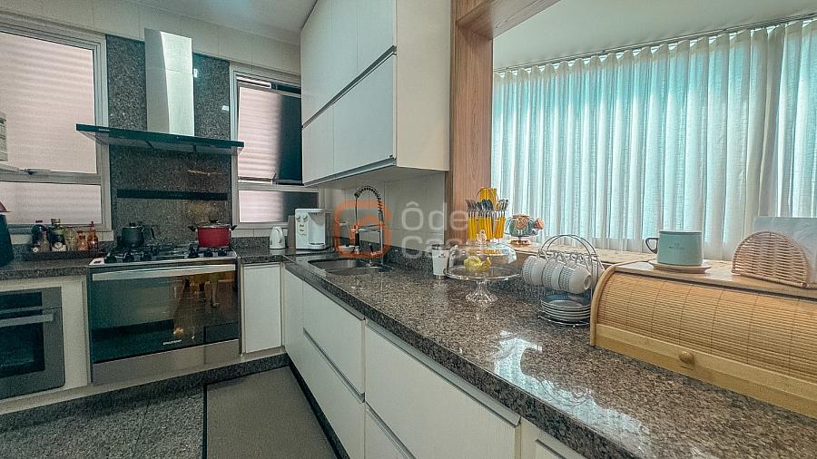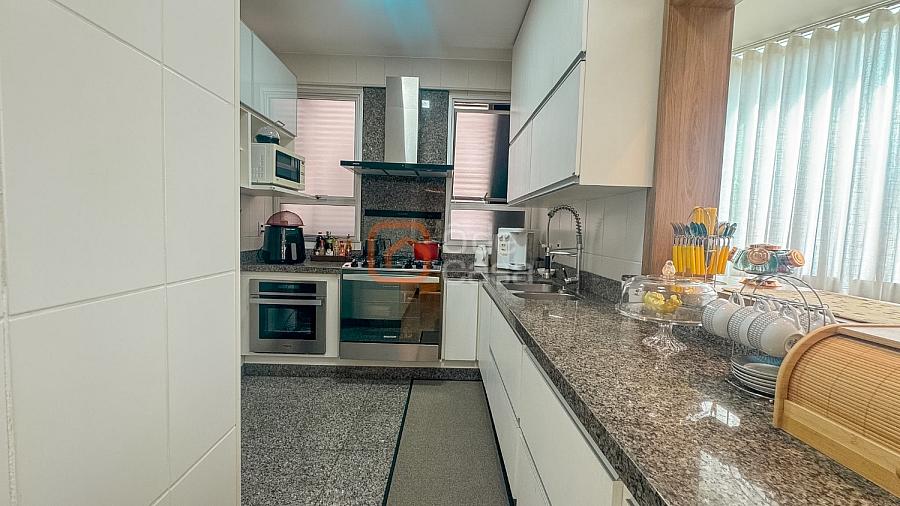 Composta por sala de TV com sonorização embutida, ar-condicionado de 22mil BTUs, sala de jantar com linda vista, e sala de estar, cozinha com armário, fogão embutido com forno, além do forno convencional, coifa, despensa, área de serviço independente.