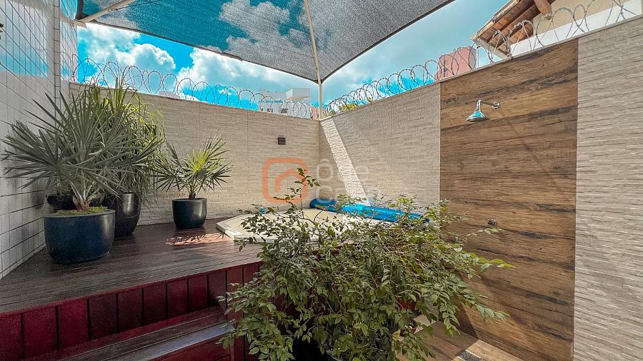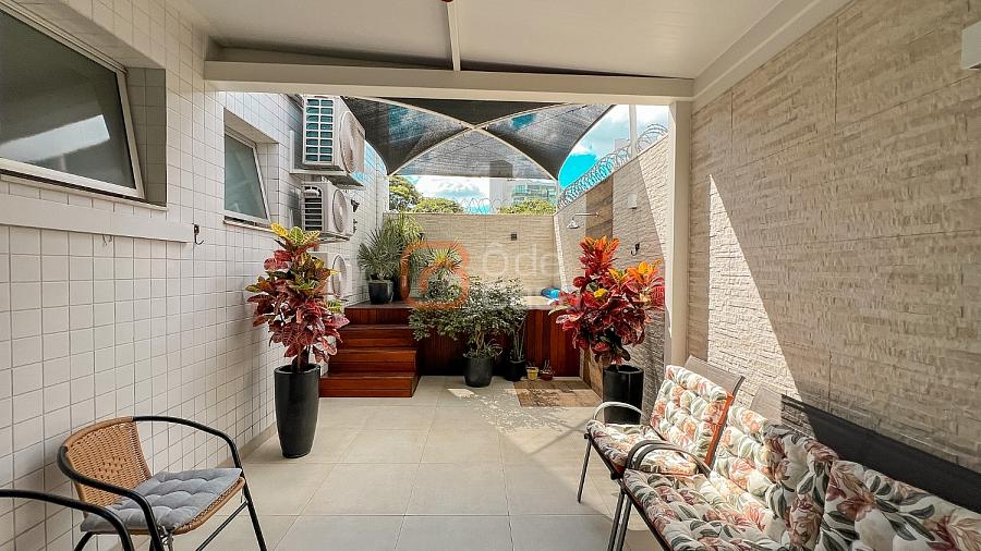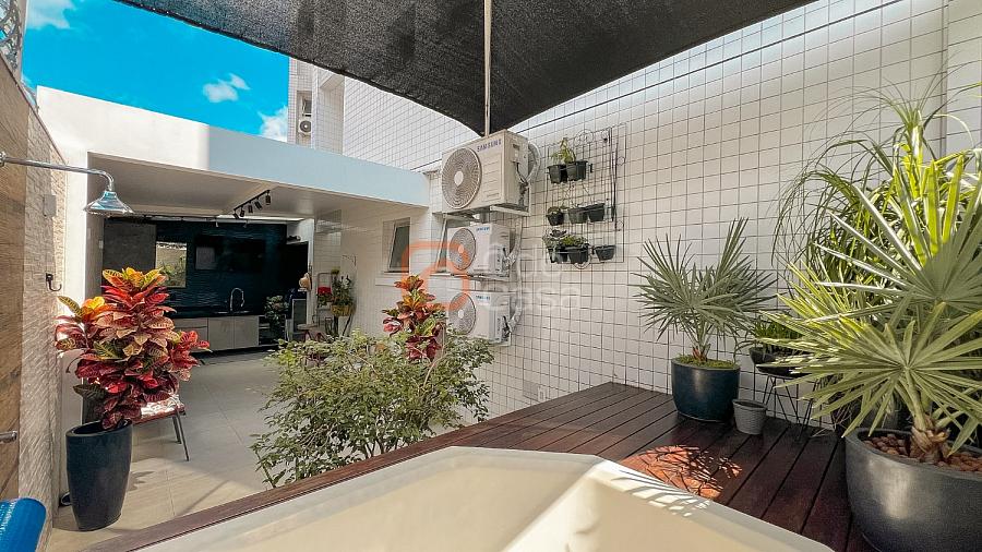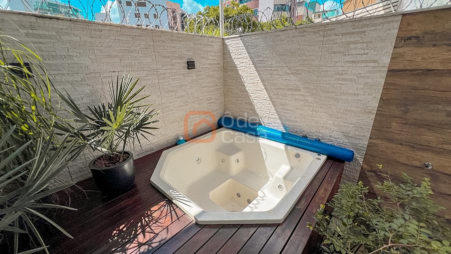 Área privativa semi-coberta, com jacuzzi para 6 lugares com aquecimento elétrico e hidromassagem, ducha, espaço gourmet com churrasqueira e armário planejado.