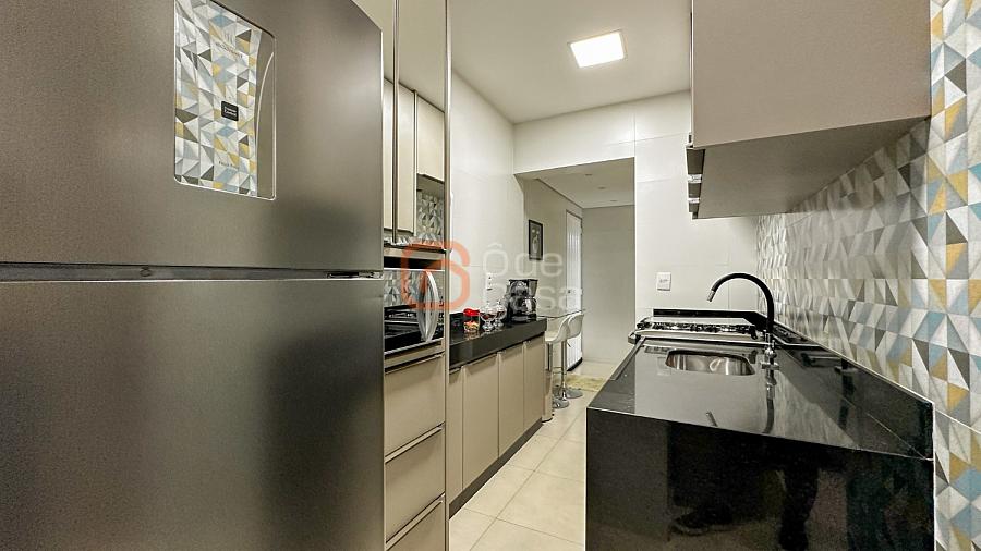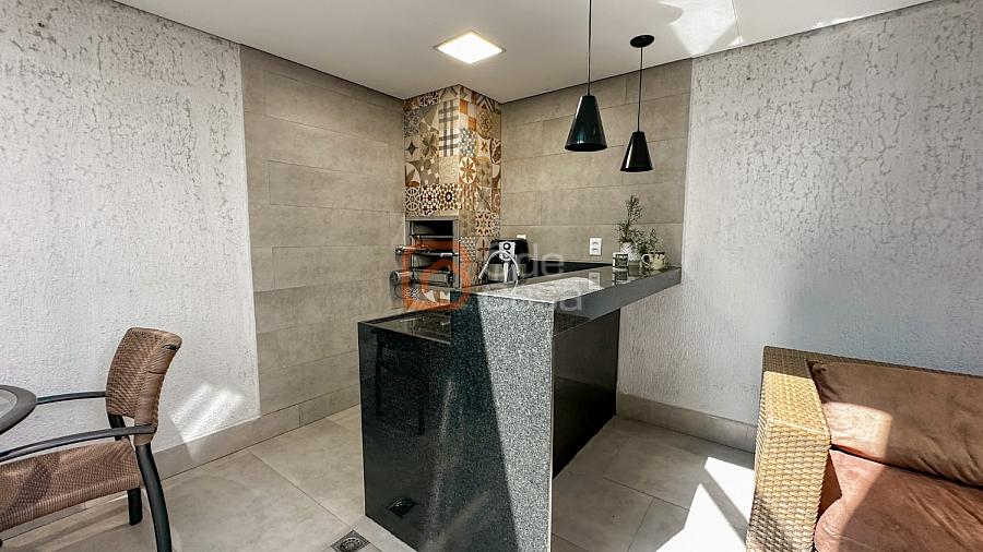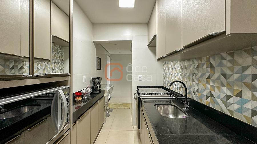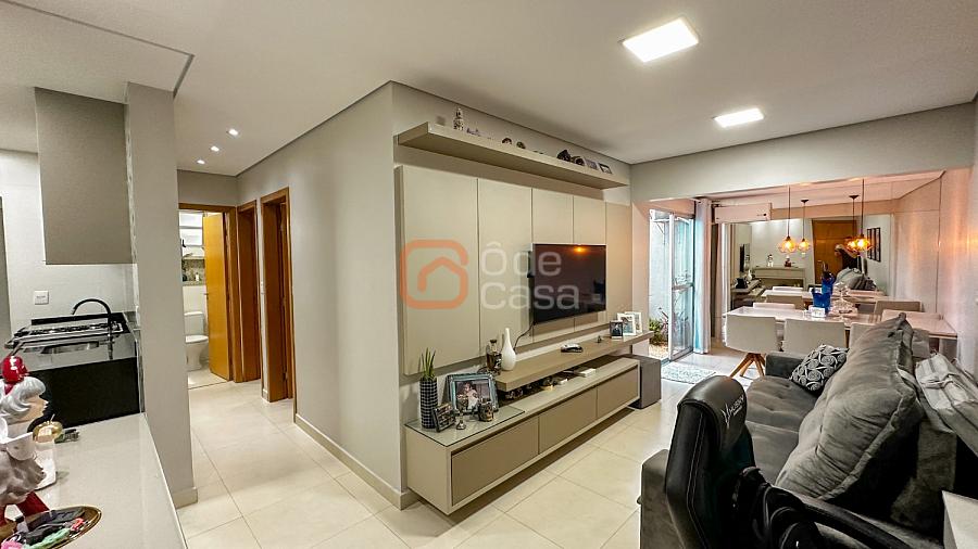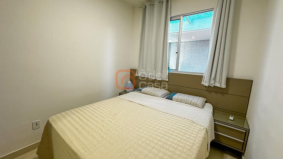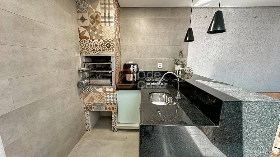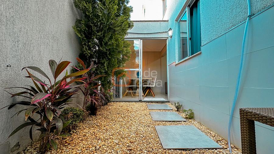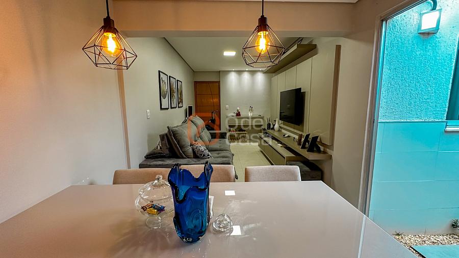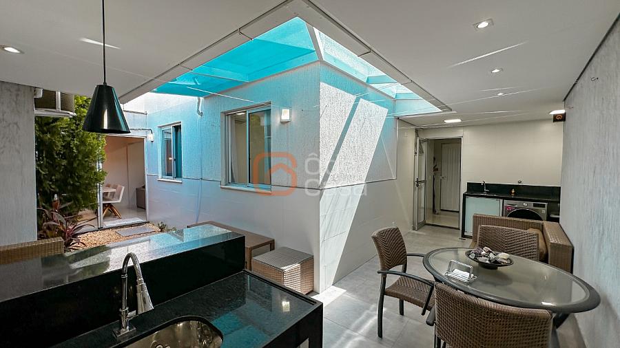 Sala para dois ambientes com painel de TV e ar-condicionado, cozinha com fogão e armários, banheiro social, 2 quartos com armários e um deles com ar-condicionado. Área privativa em “L” com espaço gourmet com churrasqueira, coberta com cobertura de vidro, espaço descoberto com jardim e área de serviço.