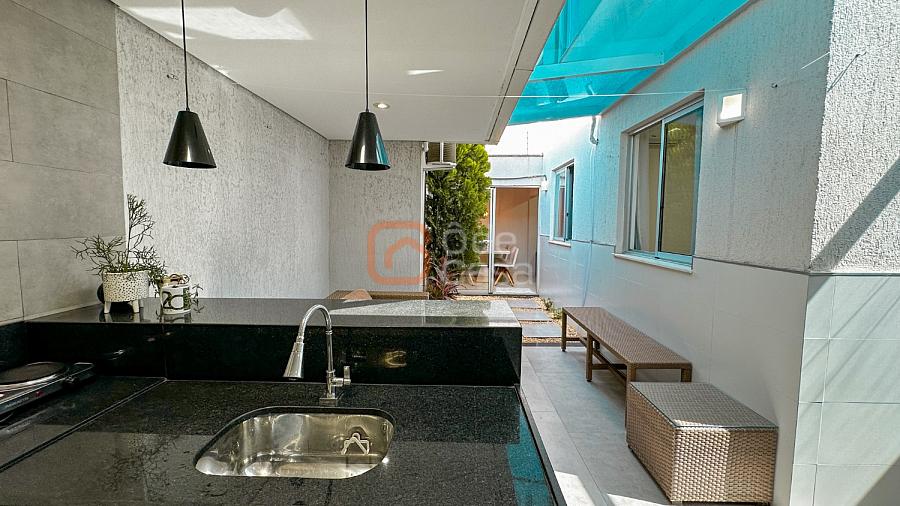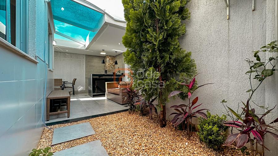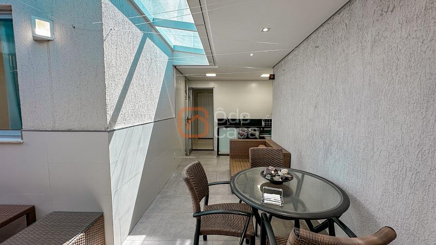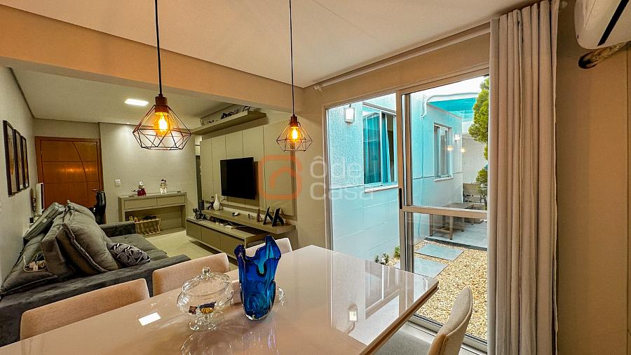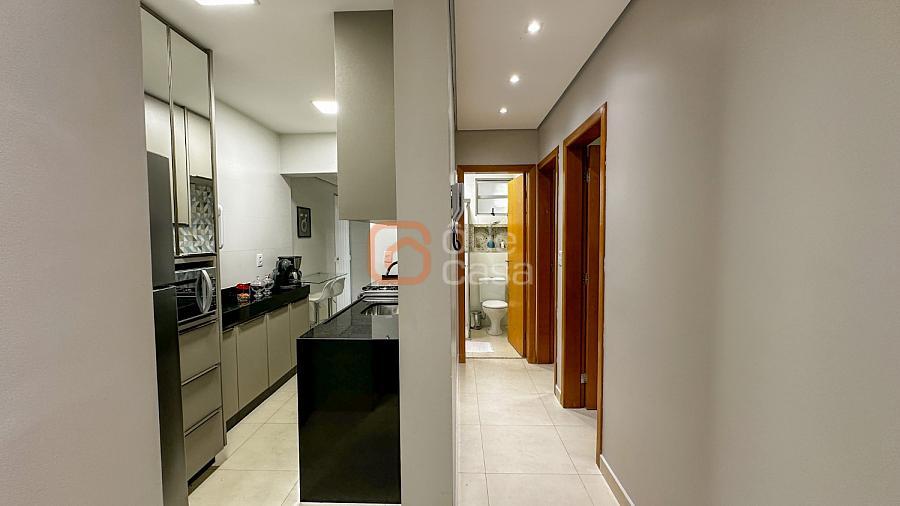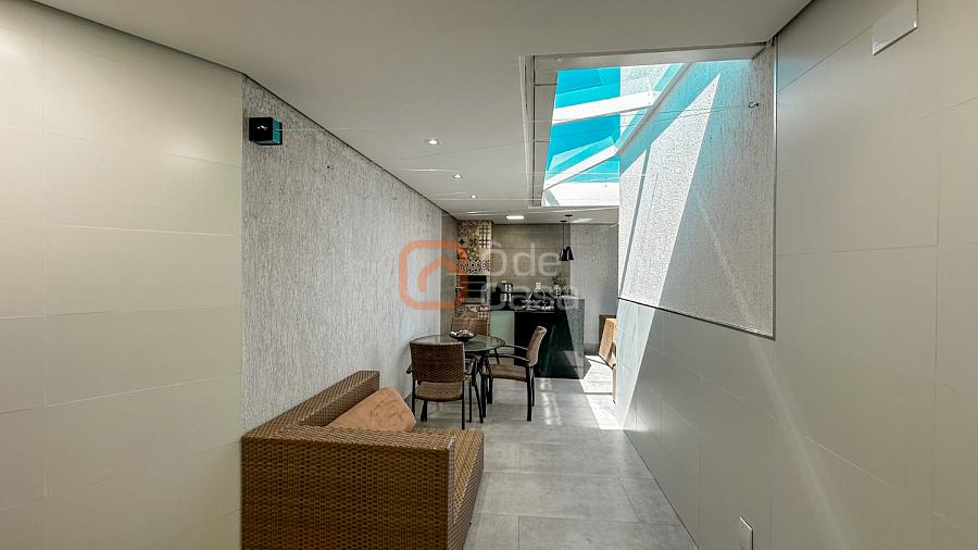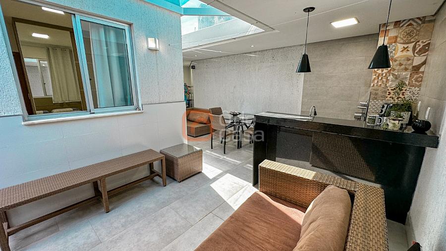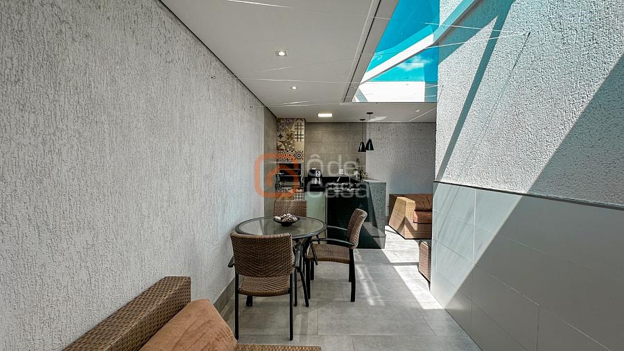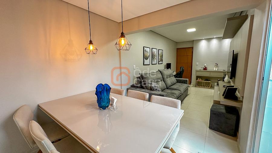 Sala para dois ambientes com painel de TV e ar-condicionado, cozinha com fogão e armários, banheiro social, 2 quartos com armários e um deles com ar-condicionado. Área privativa em “L” com espaço gourmet com churrasqueira, coberta com cobertura de vidro, espaço descoberto com jardim e área de serviço.