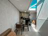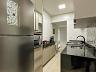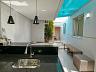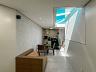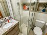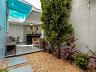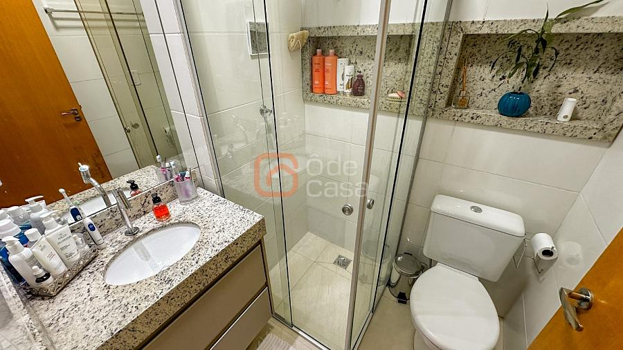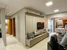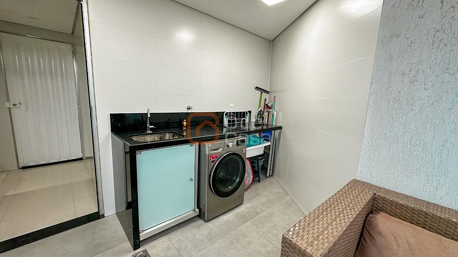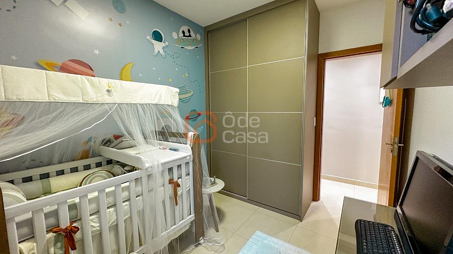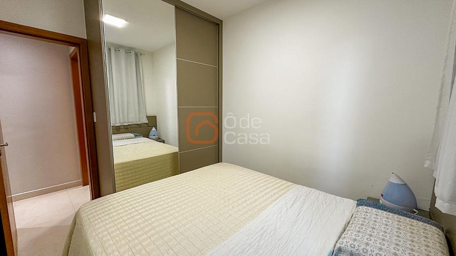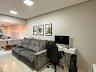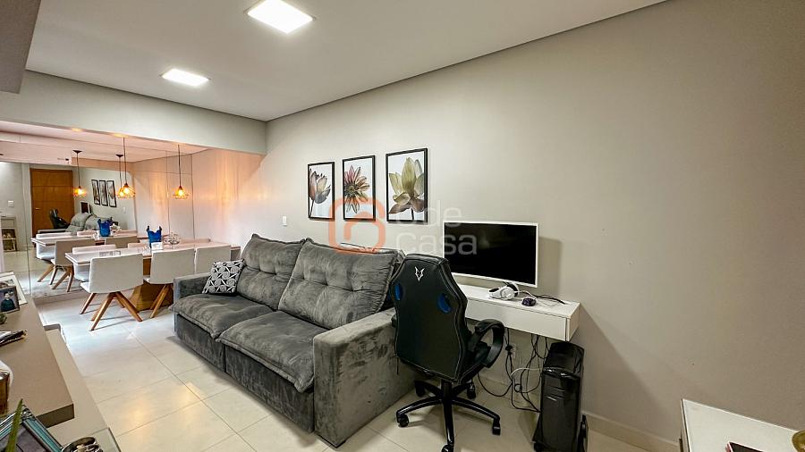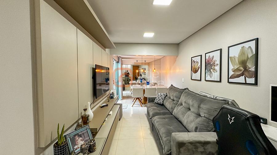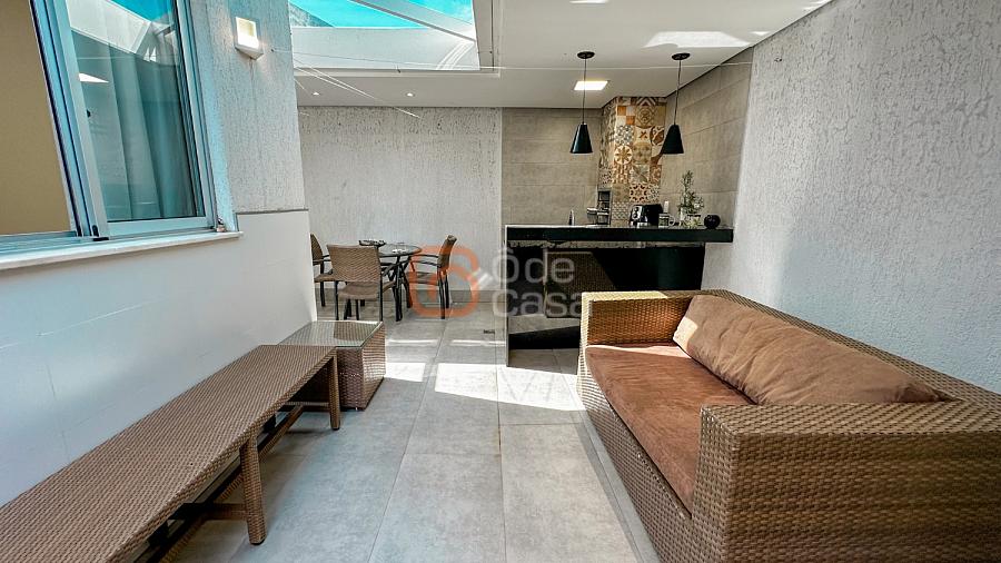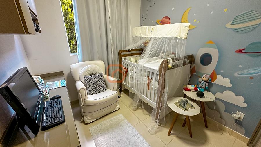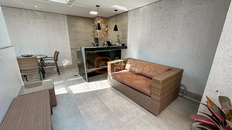 Sala para dois ambientes com painel de TV e ar-condicionado, cozinha com fogão e armários, banheiro social, 2 quartos com armários e um deles com ar-condicionado. Área privativa em “L” com espaço gourmet com churrasqueira, coberta com cobertura de vidro, espaço descoberto com jardim e área de serviço.