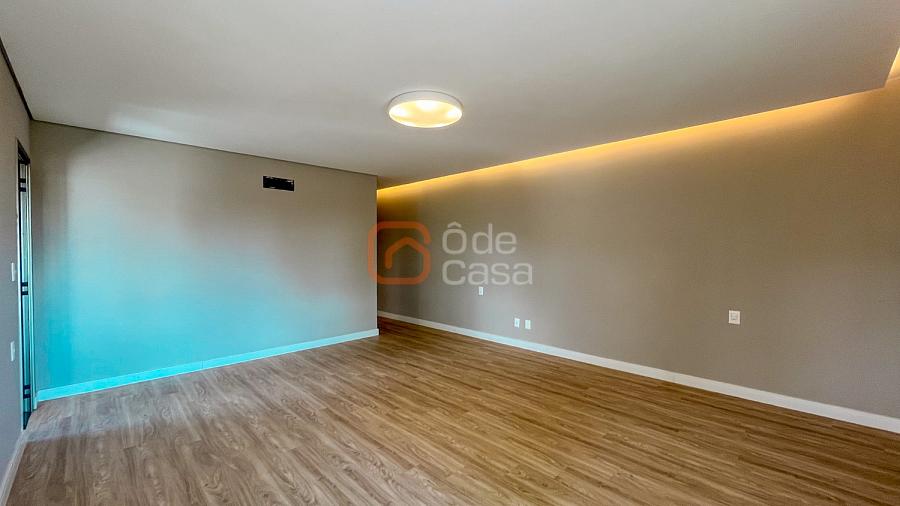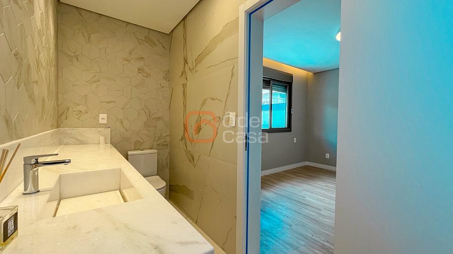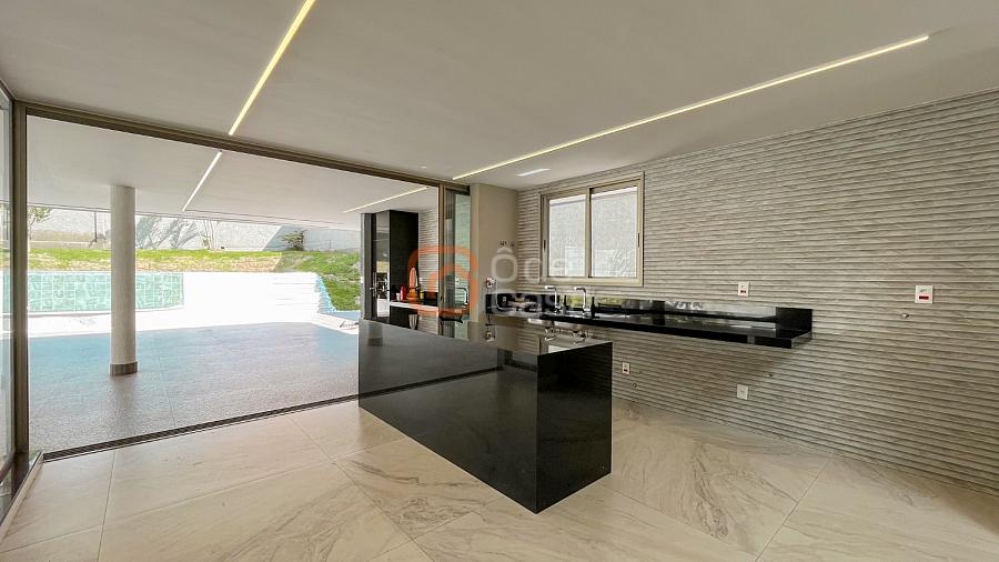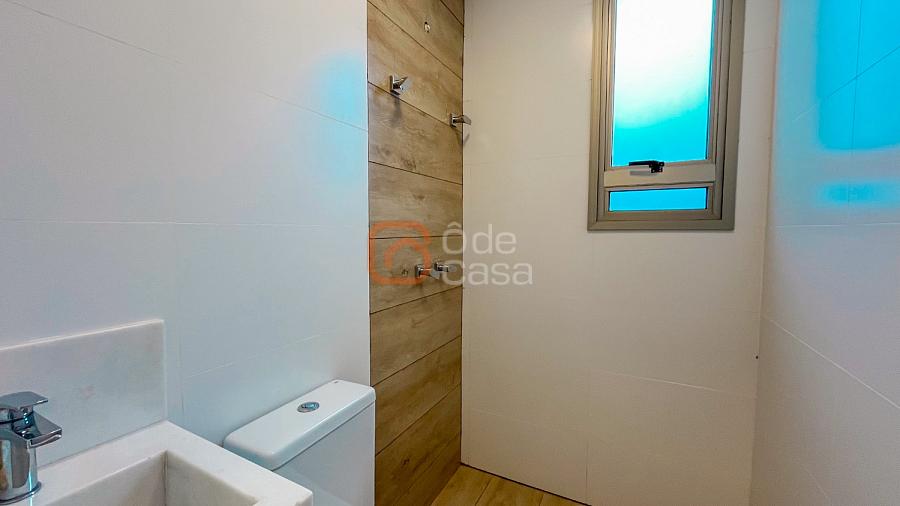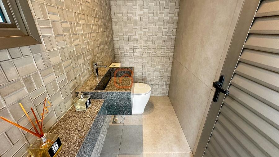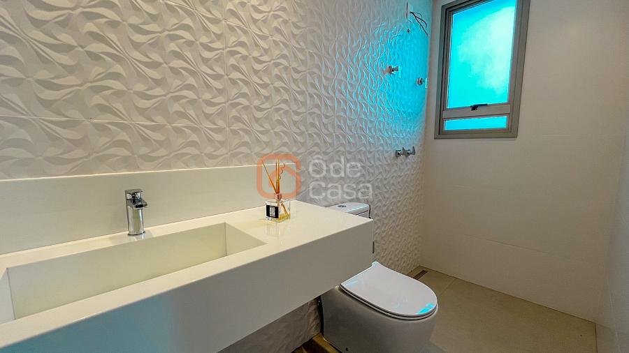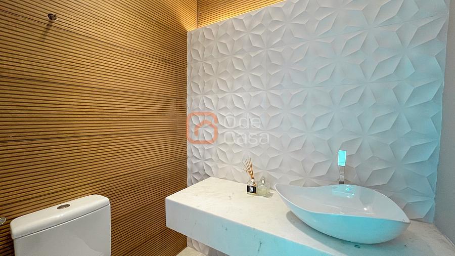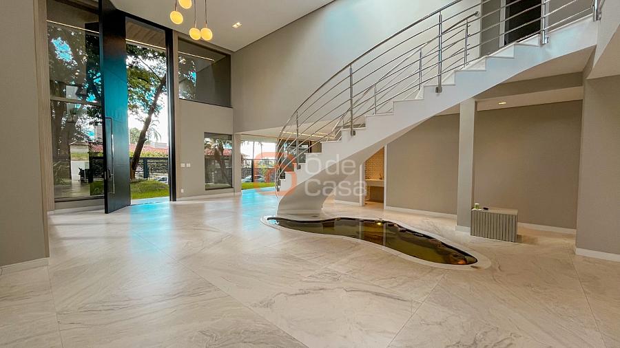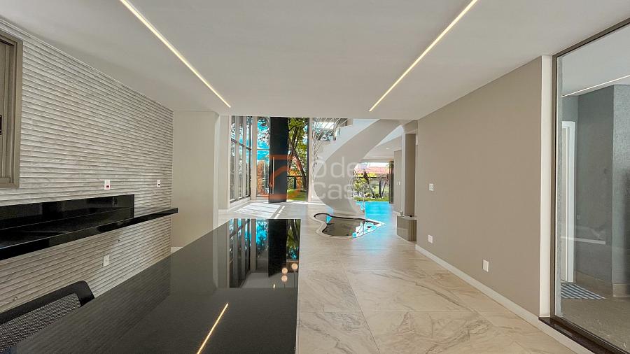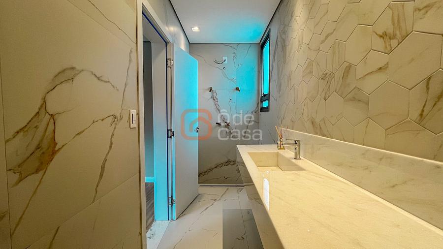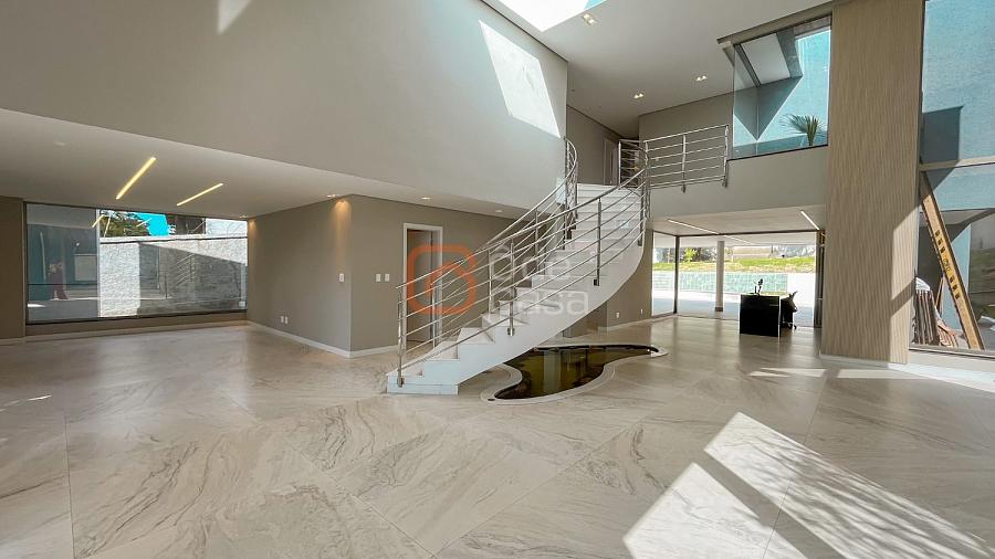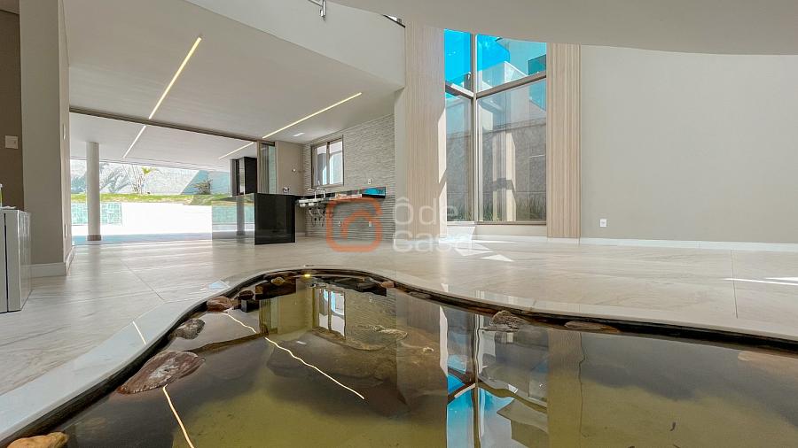 Térreo: Sala em L para vários ambientes, com um lago interno, iluminação planejada, rebaixamento em gesso e portal de vidro, com pé direito duplo, lavabo, DCE completo e cozinha americana ampla, equipada com ilha em granito, ideal para quem ama receber.