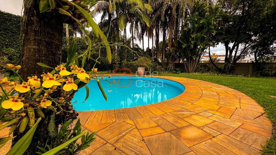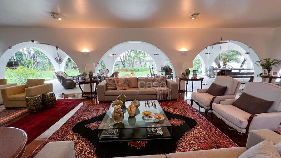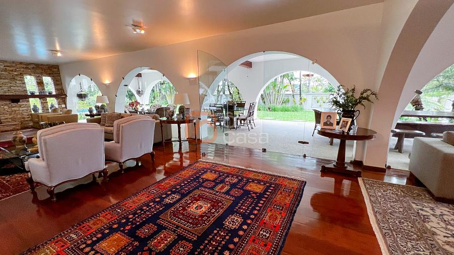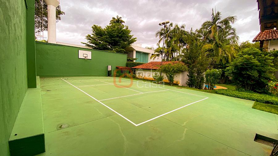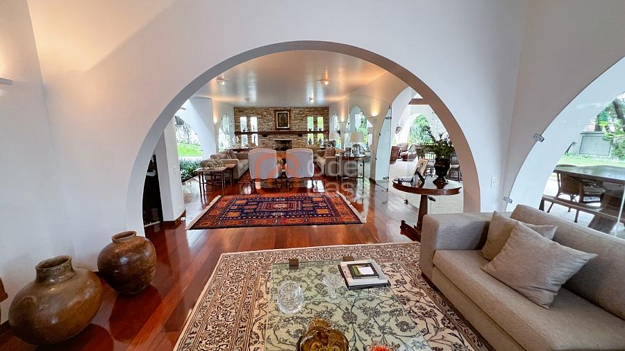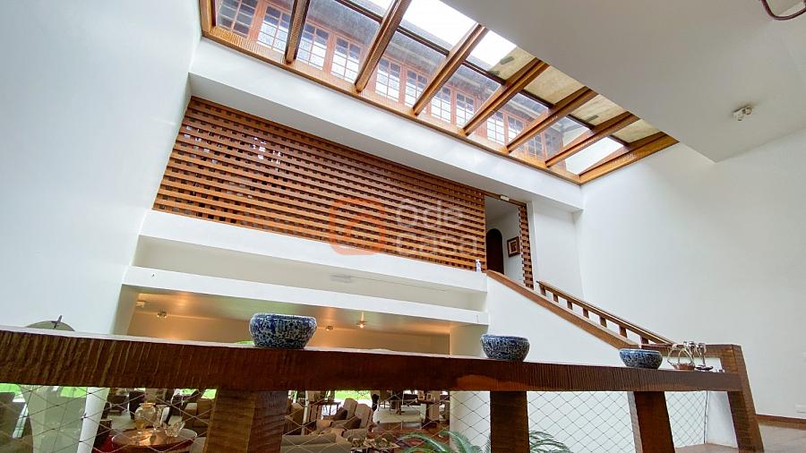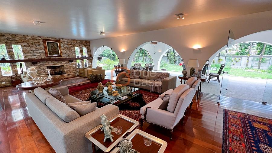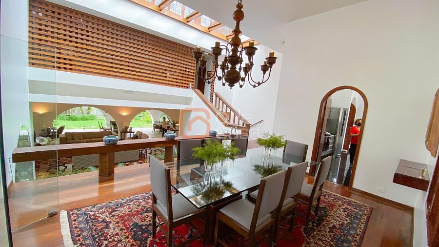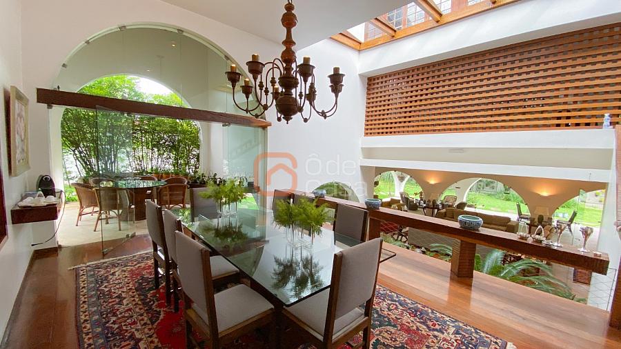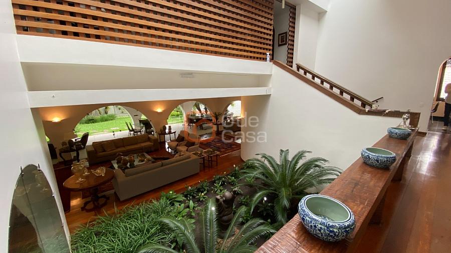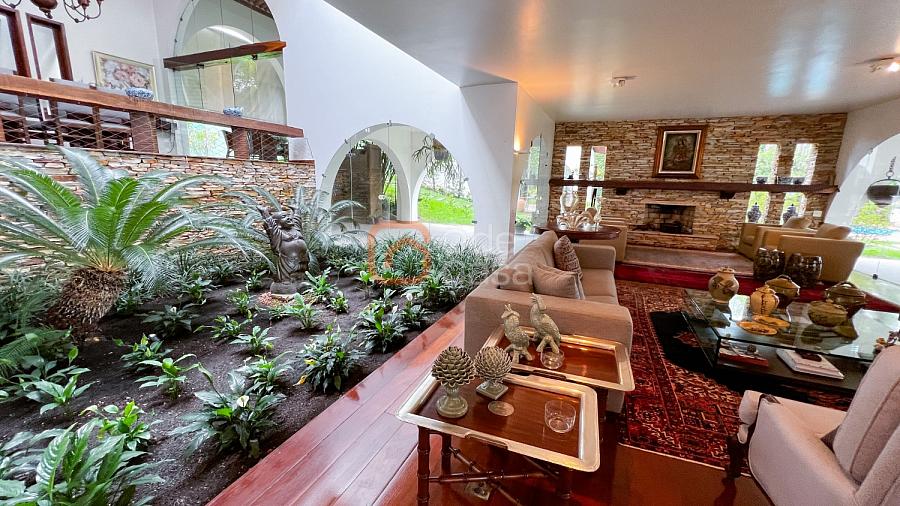 1° Pavimento: Sala ampla para 3 ambientes, varanda frontal, lareira, jardim de inverno, adega, ampla área verde, piscina redonda, quadra poliesportiva e salão de festas.