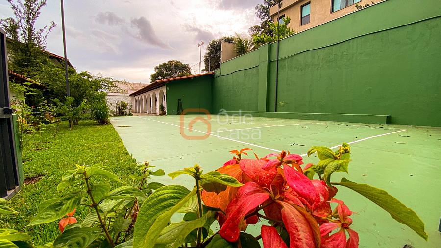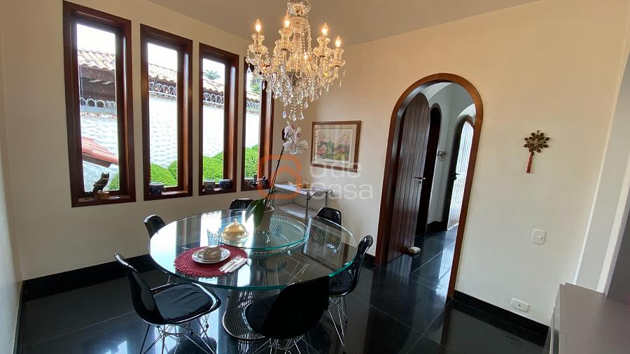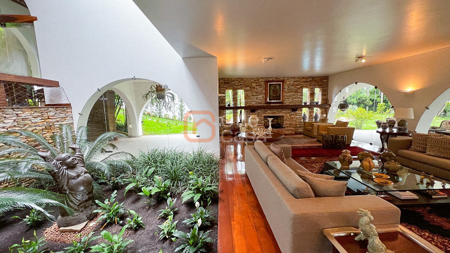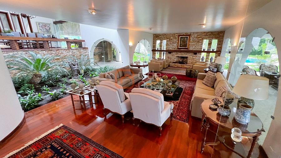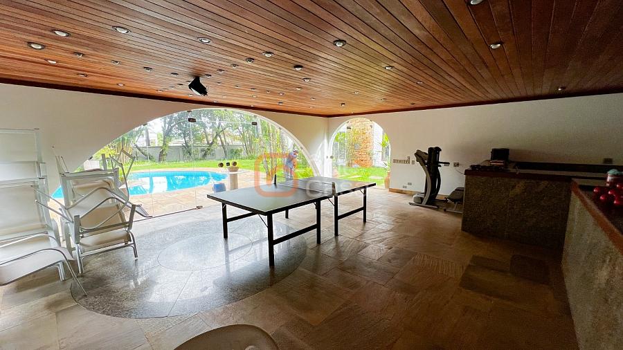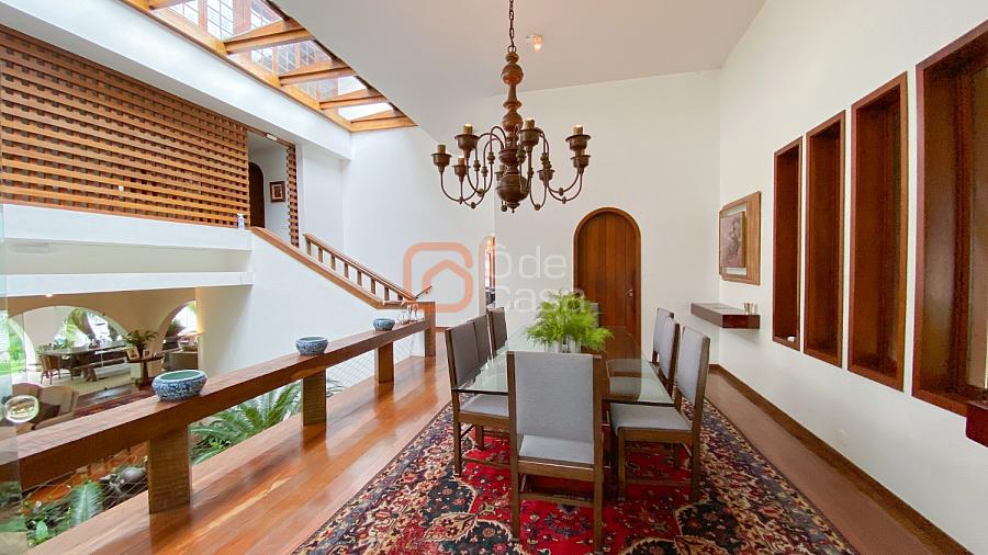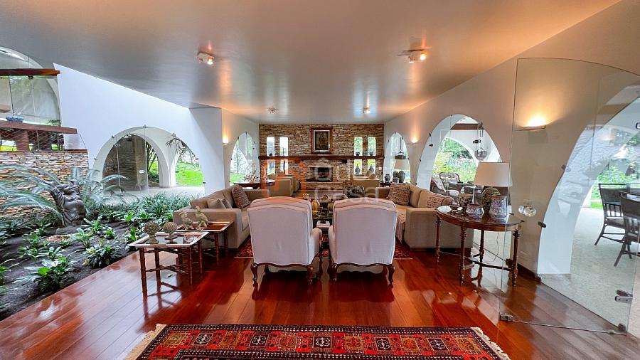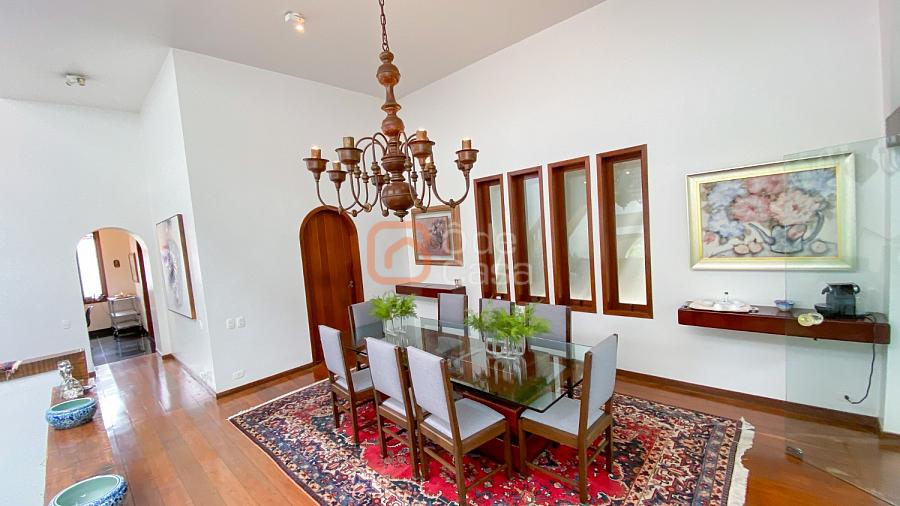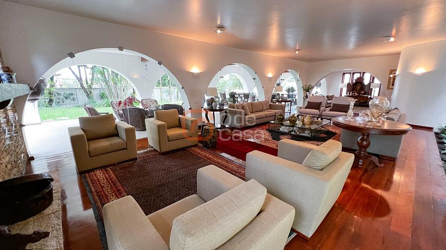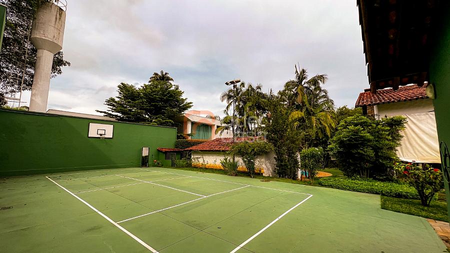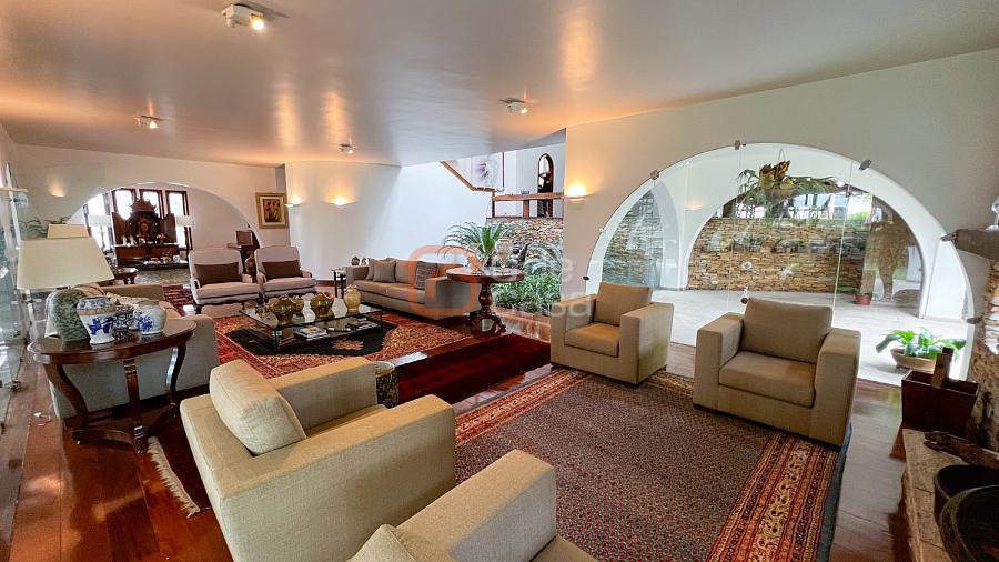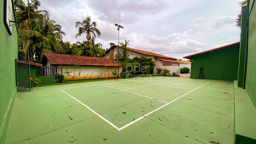 1° Pavimento: Sala ampla para 3 ambientes, varanda frontal, lareira, jardim de inverno, adega, ampla área verde, piscina redonda, quadra poliesportiva e salão de festas.