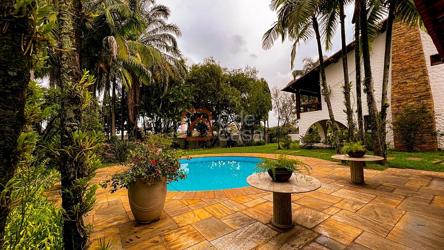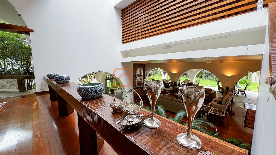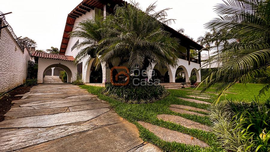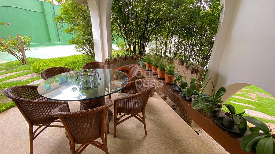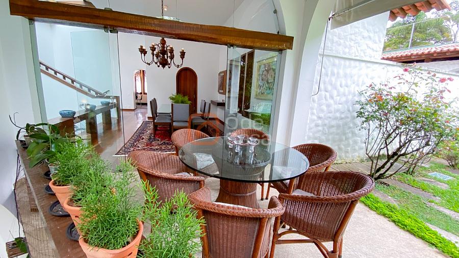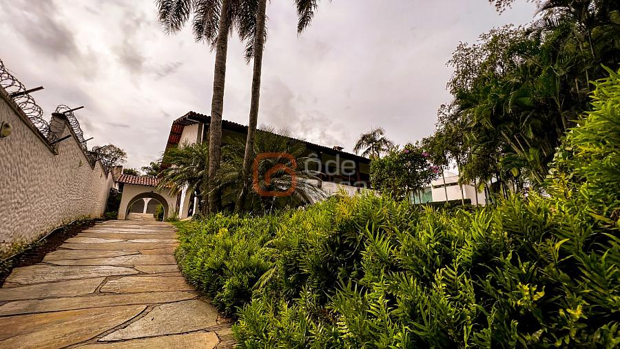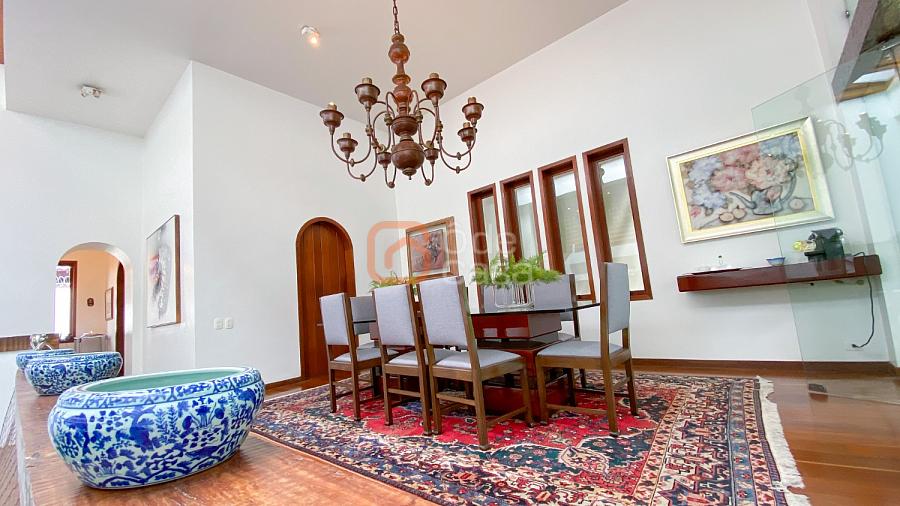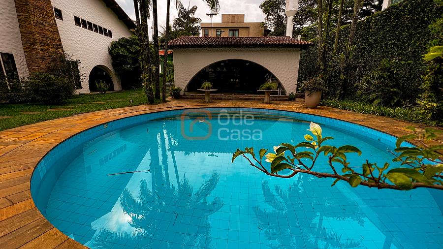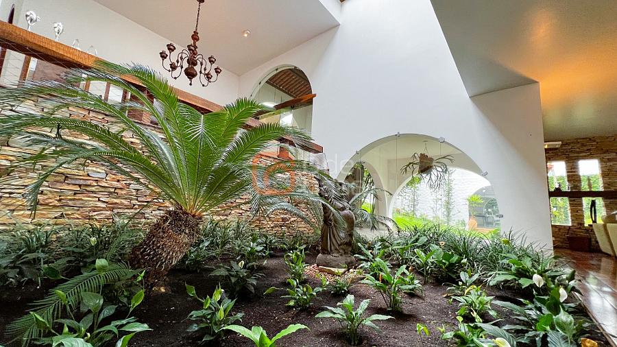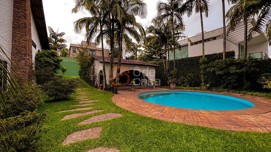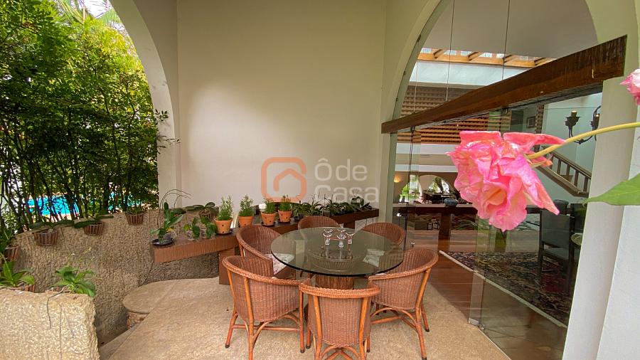 1° Pavimento: Sala ampla para 3 ambientes, varanda frontal, lareira, jardim de inverno, adega, ampla área verde, piscina redonda, quadra poliesportiva e salão de festas.