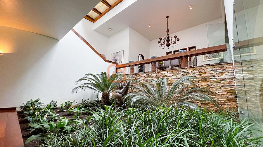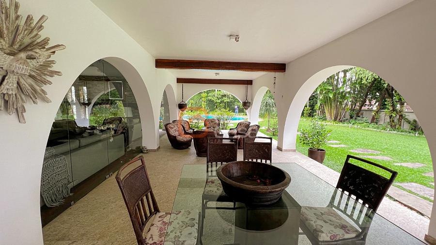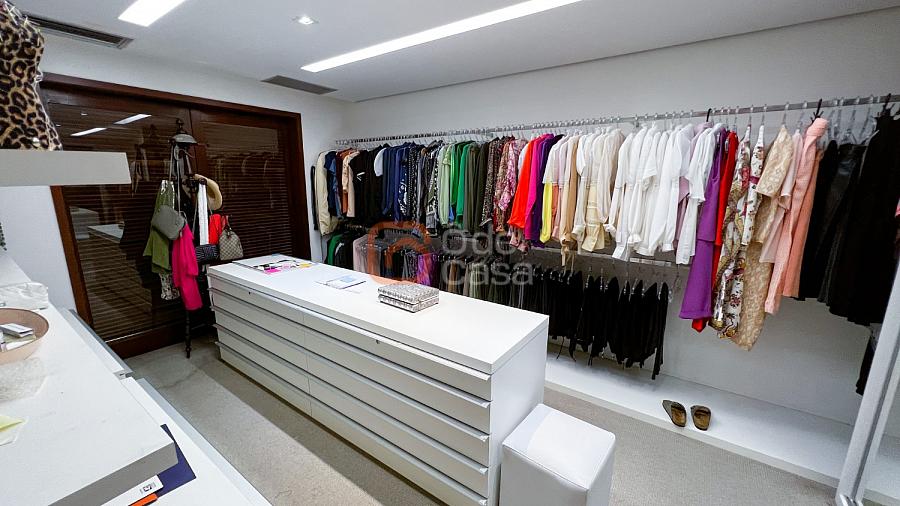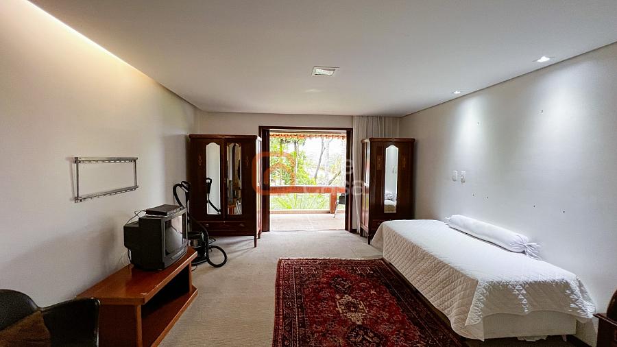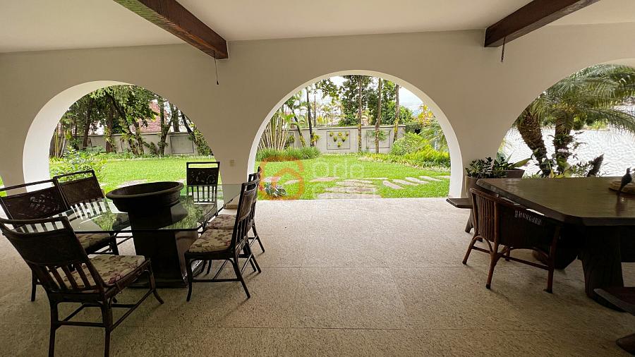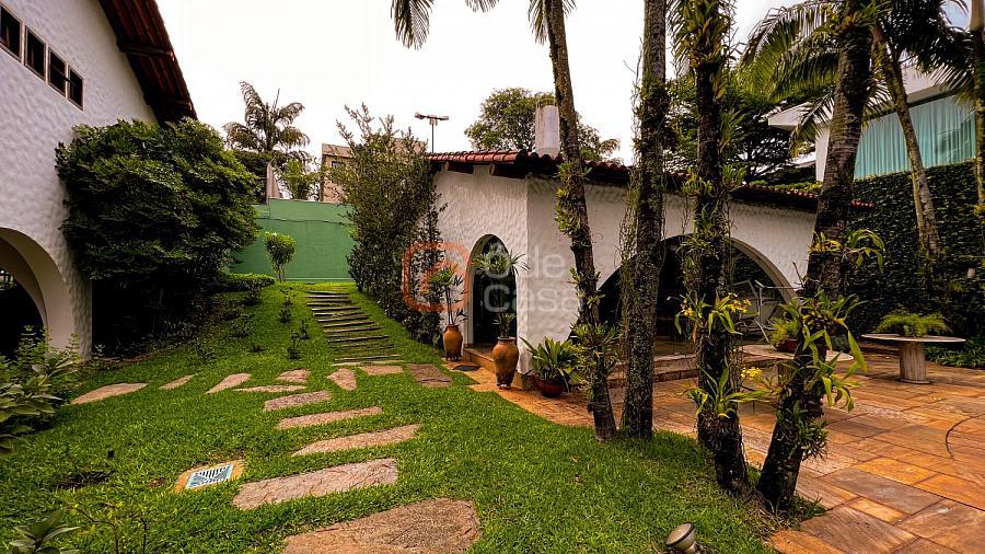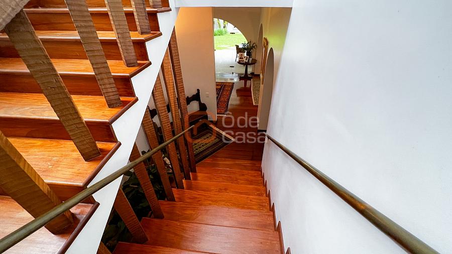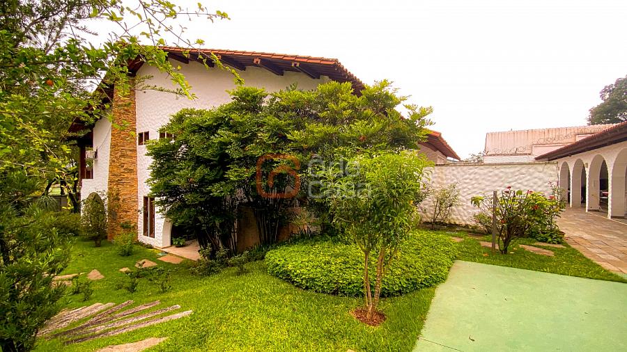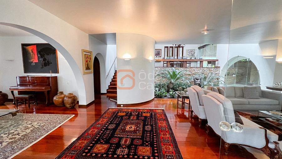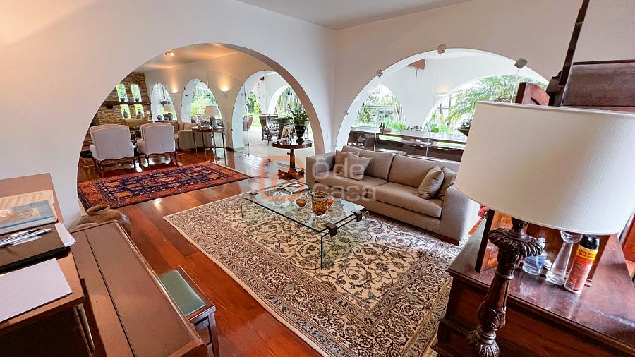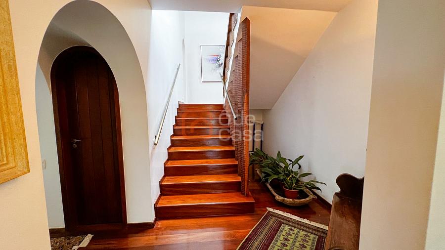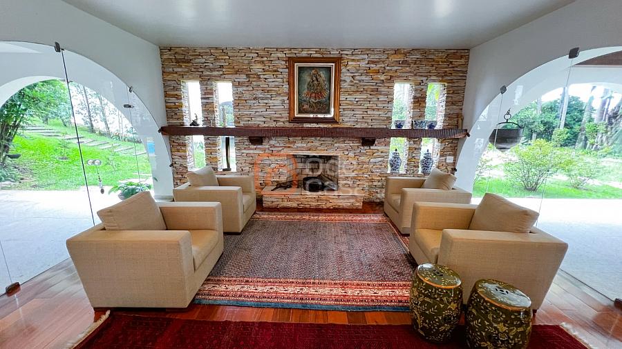 1° Pavimento: Sala ampla para 3 ambientes, varanda frontal, lareira, jardim de inverno, adega, ampla área verde, piscina redonda, quadra poliesportiva e salão de festas.