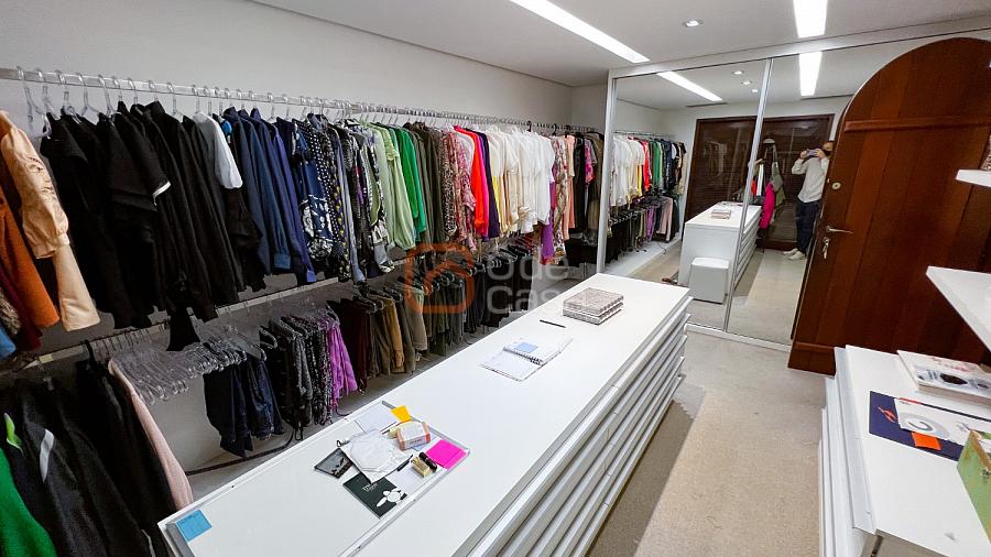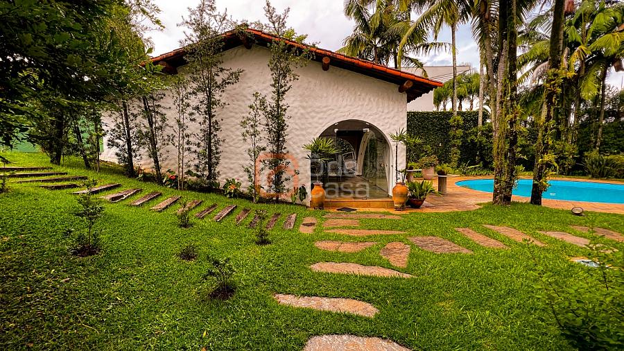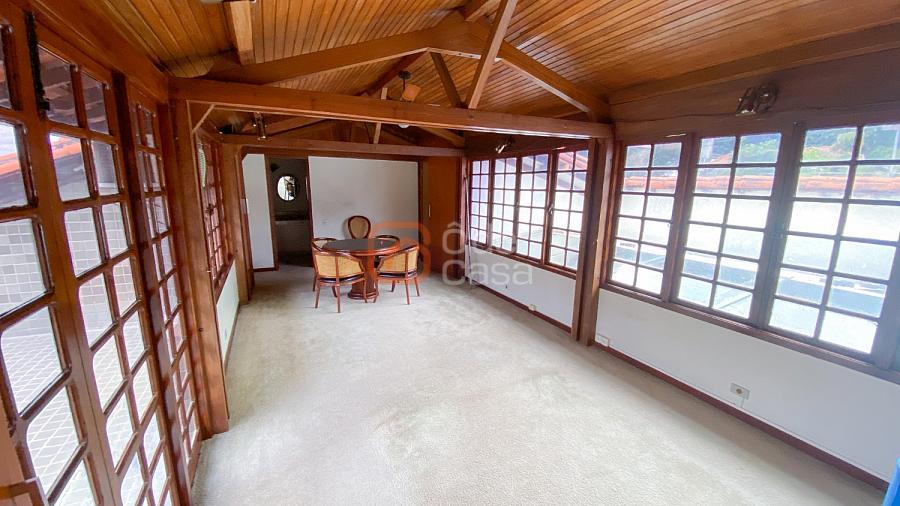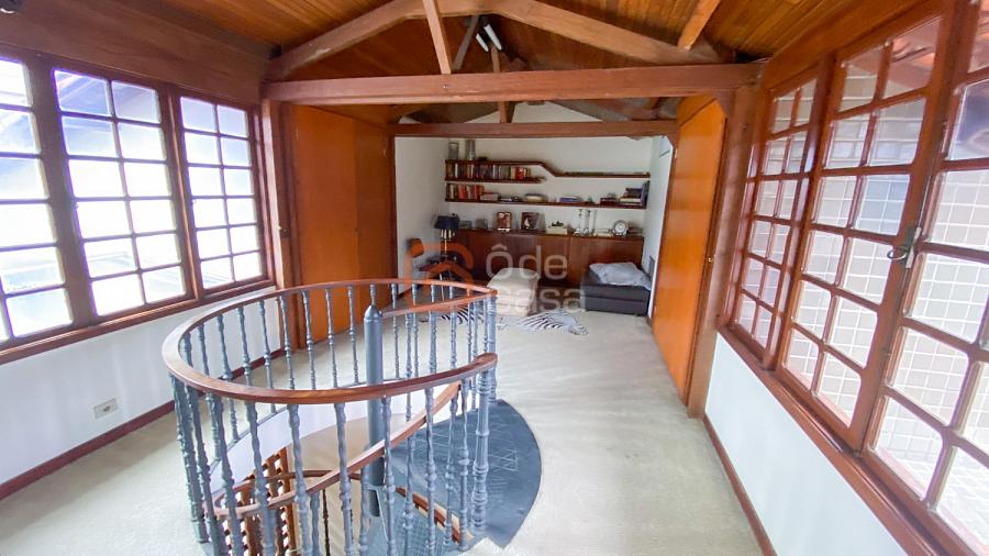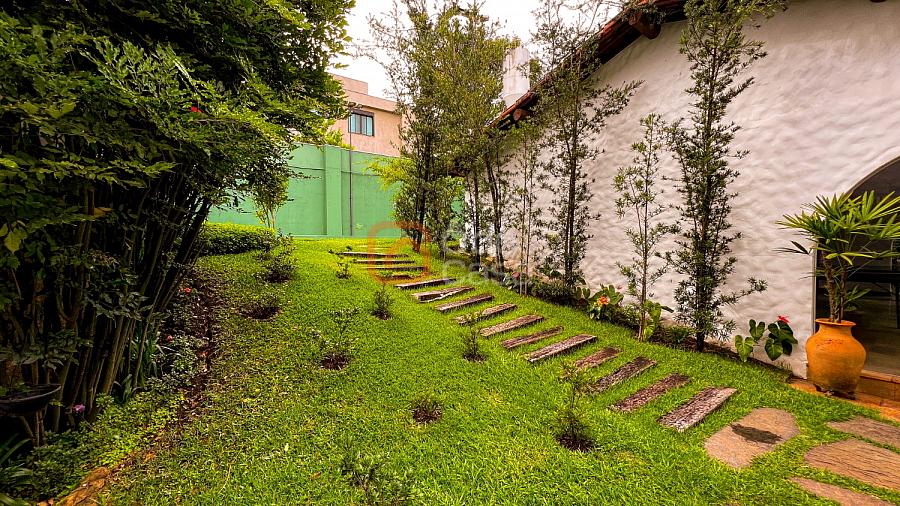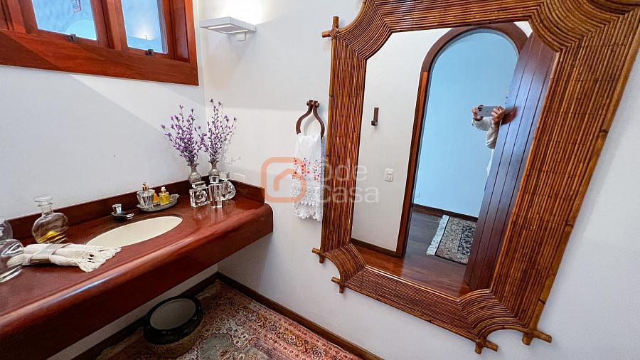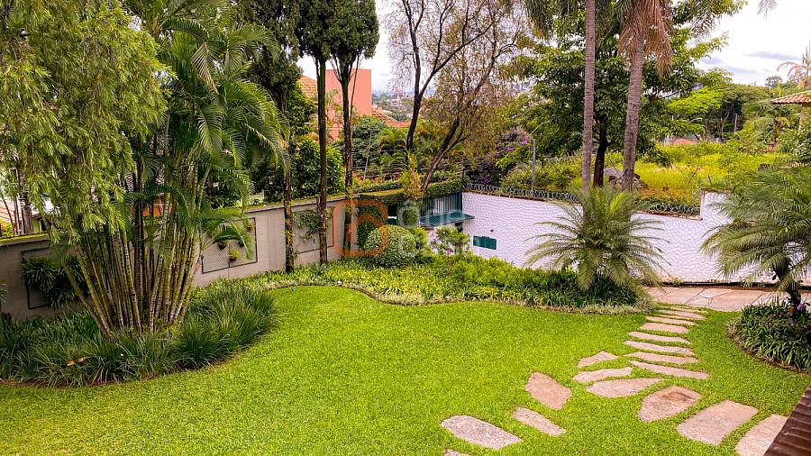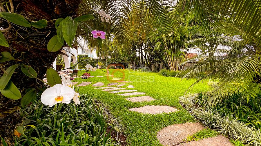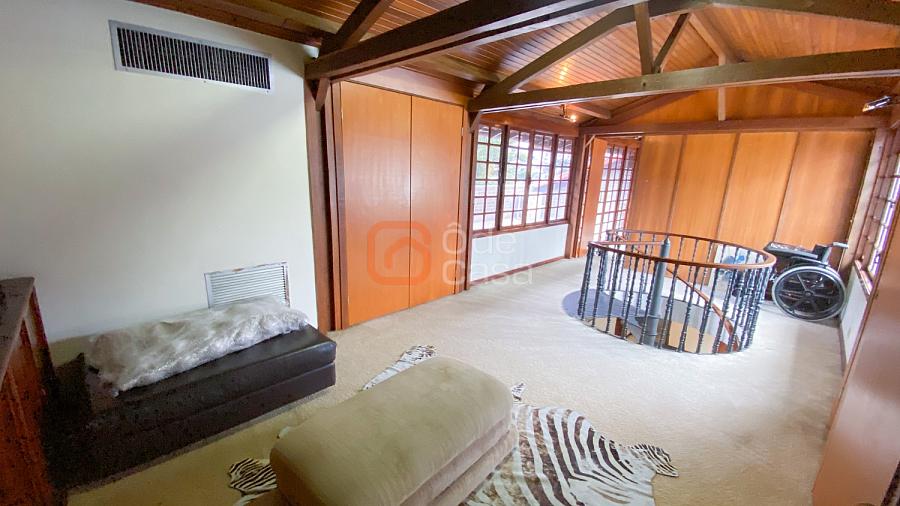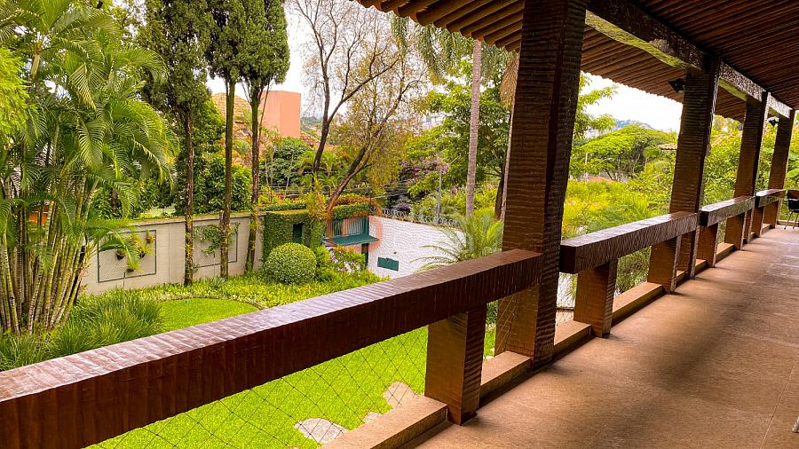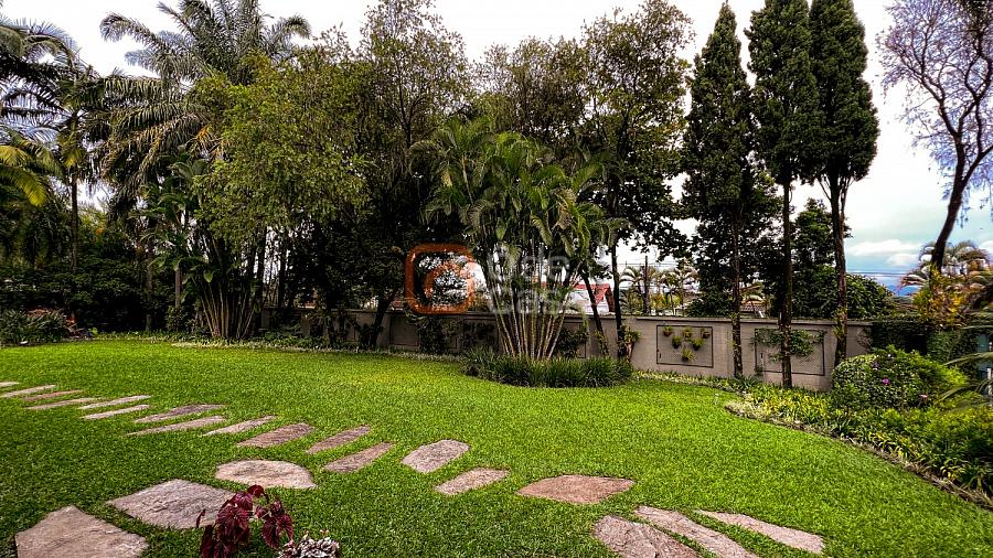 1° Pavimento: Sala ampla para 3 ambientes, varanda frontal, lareira, jardim de inverno, adega, ampla área verde, piscina redonda, quadra poliesportiva e salão de festas.