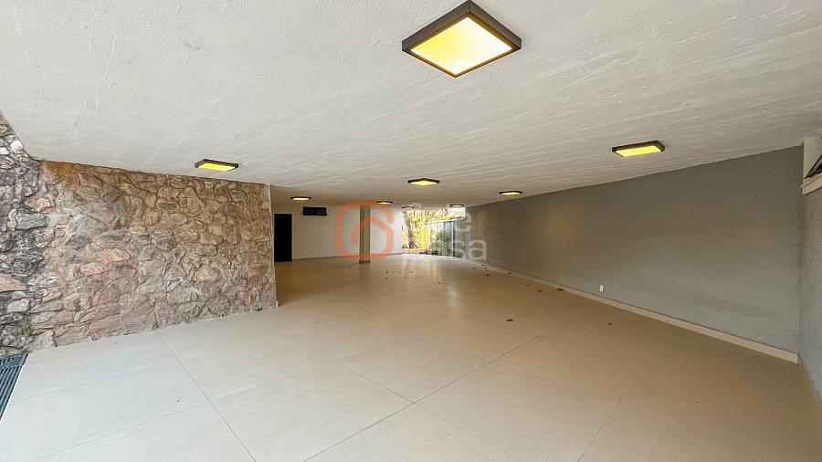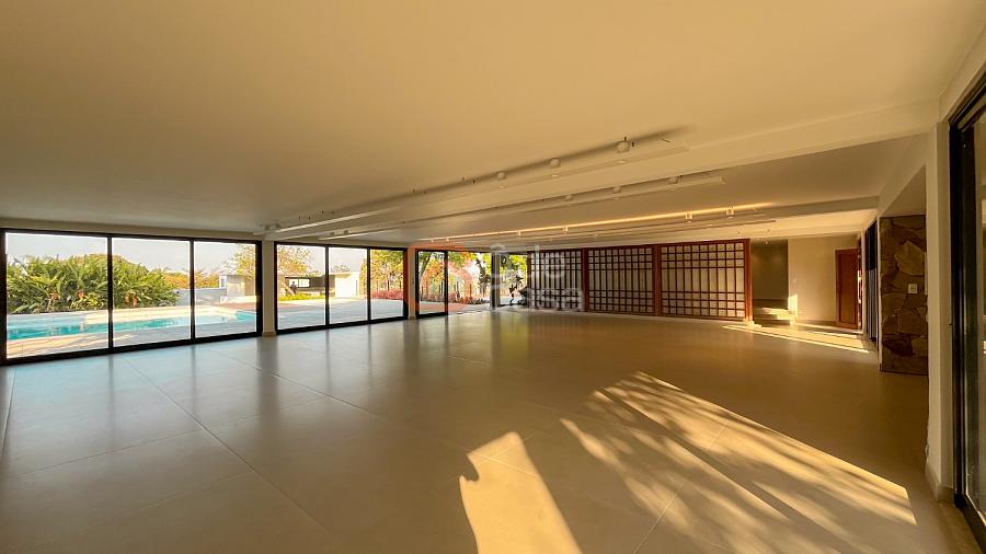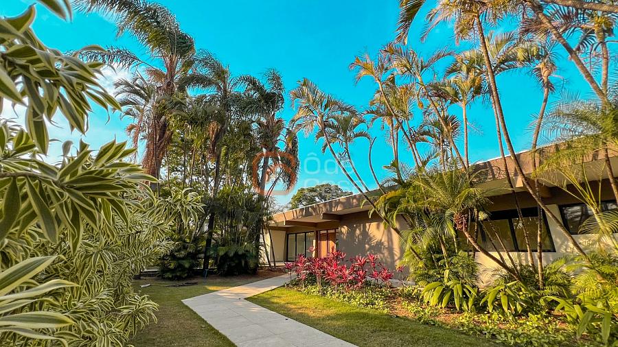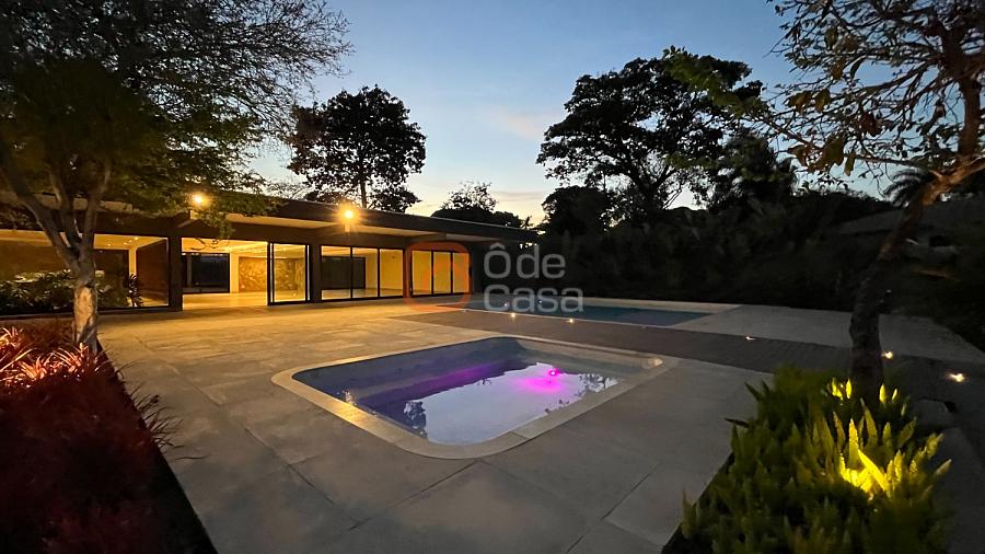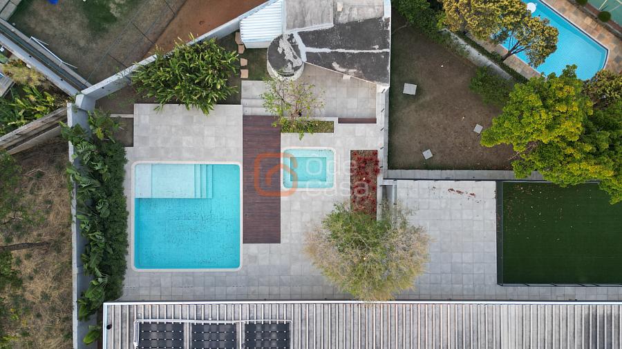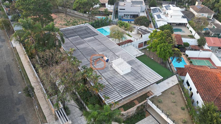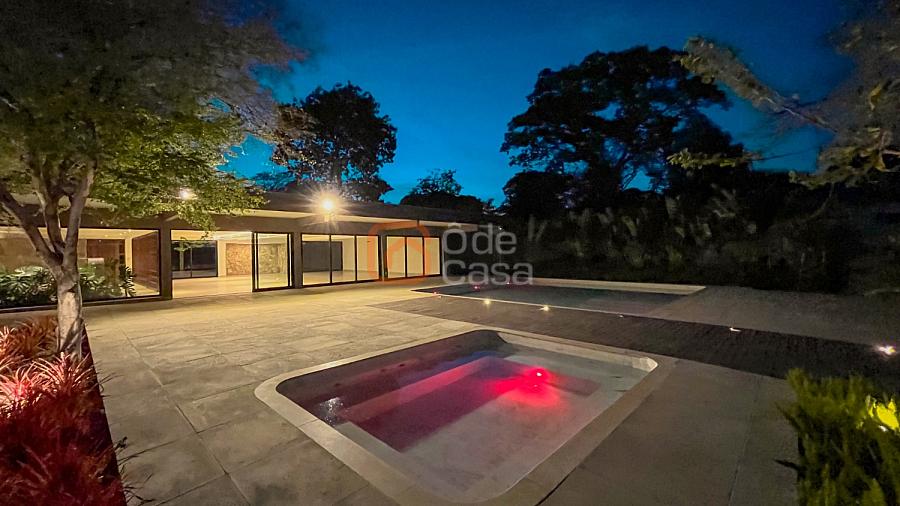 2º Pavimento (1 nível abaixo da rua): Área gramada arborizada com iluminação cênica, quarto de despejo, anexo independente com dois quartos, cozinha e lavabo, além de garagem para até 14 veículos.