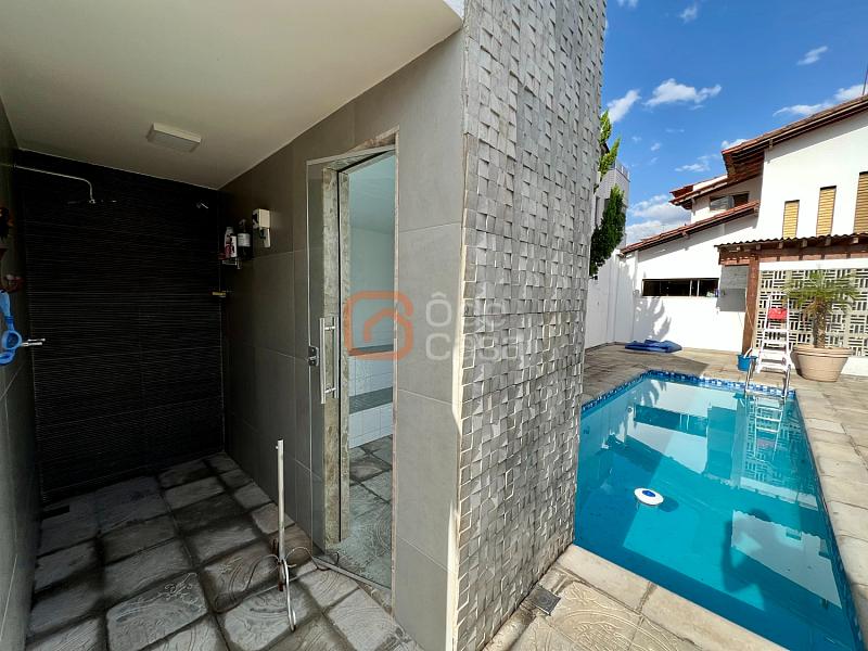 Área externa: Amplo quintal gramado, piscina aquecida, sauna a gás com acesso à piscina, ducha e banheiro externo. Espaço gourmet completa, com churrasqueira e cozinha.