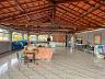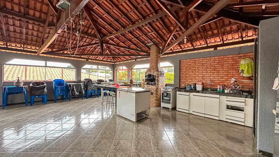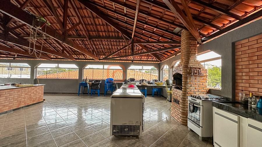 Terraço coberto com espaço gourmet com churrasqueira e banheiro social.