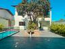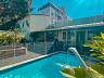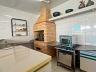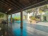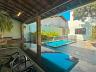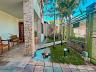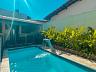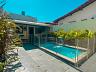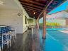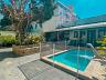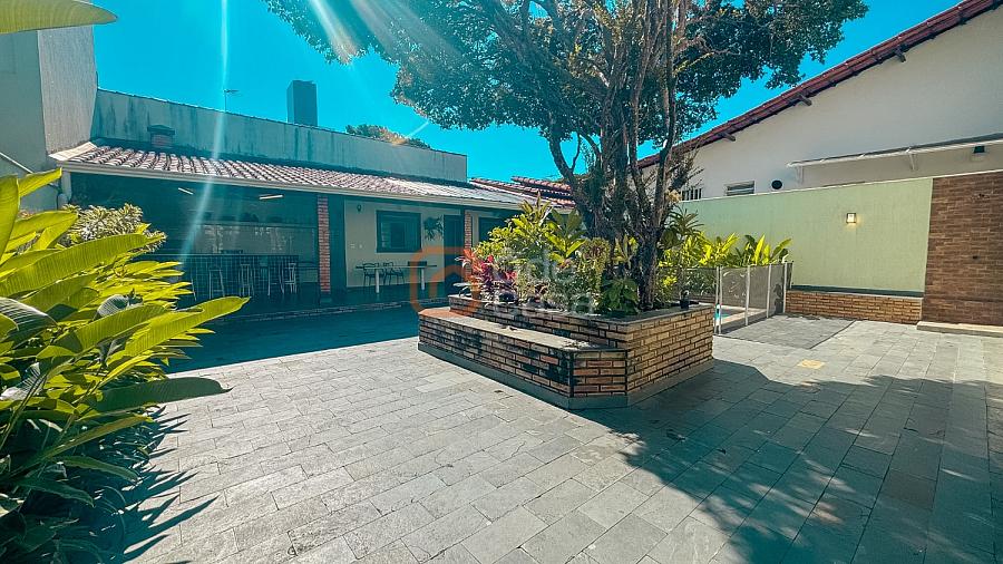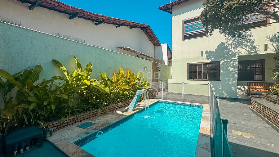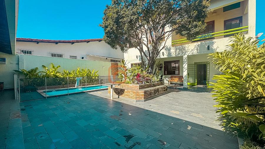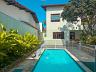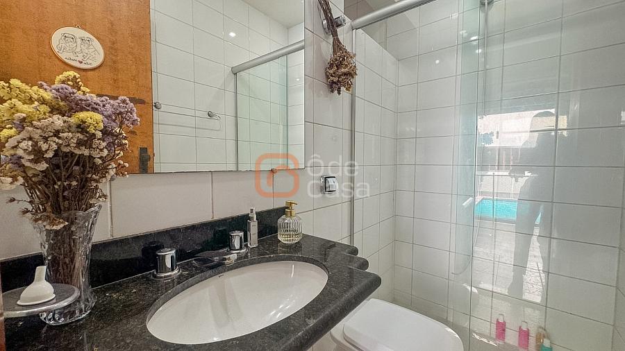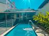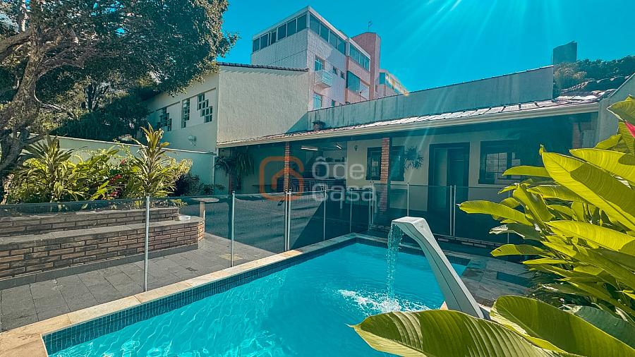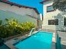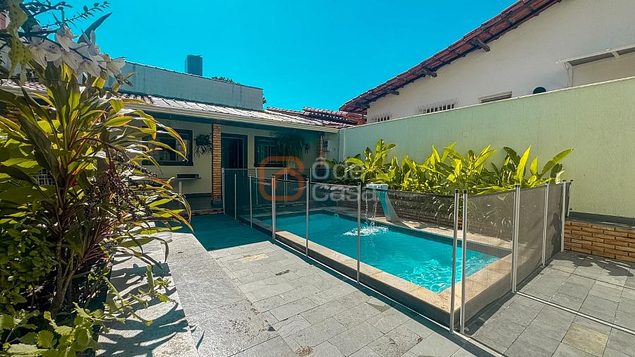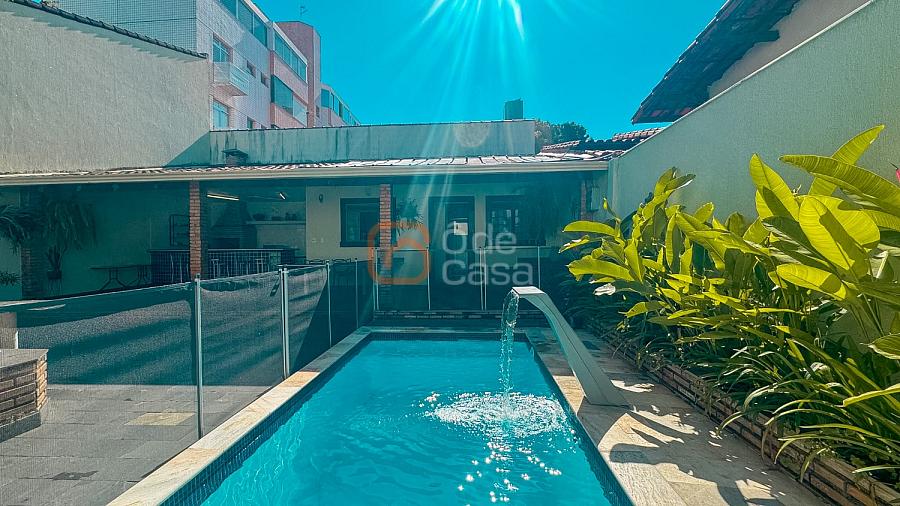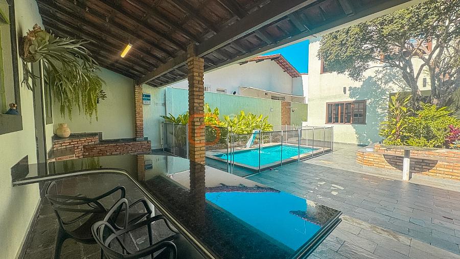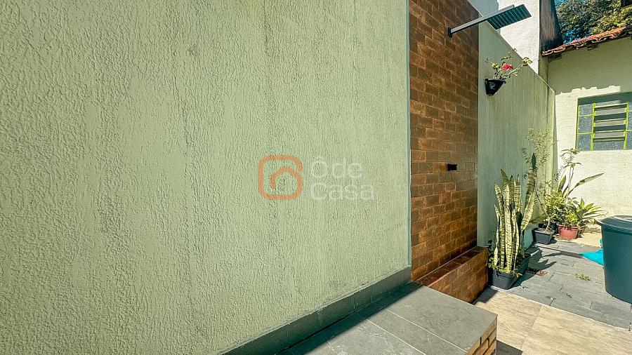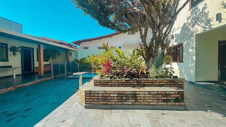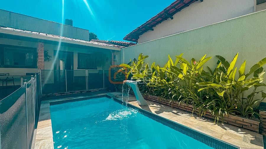 Quintal espaçoso com piscina com aquecimento solar e cascata, ducha, espaço gourmet com churrasqueira, jardim, jabuticabeira, lavanderia independente, banheiro externo e 1 quarto.