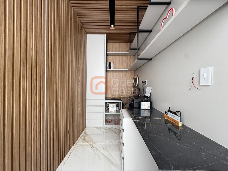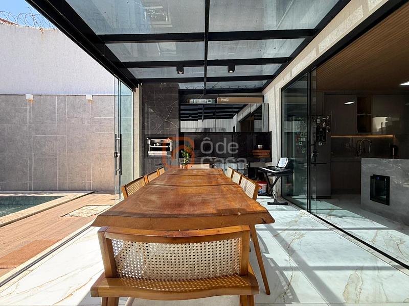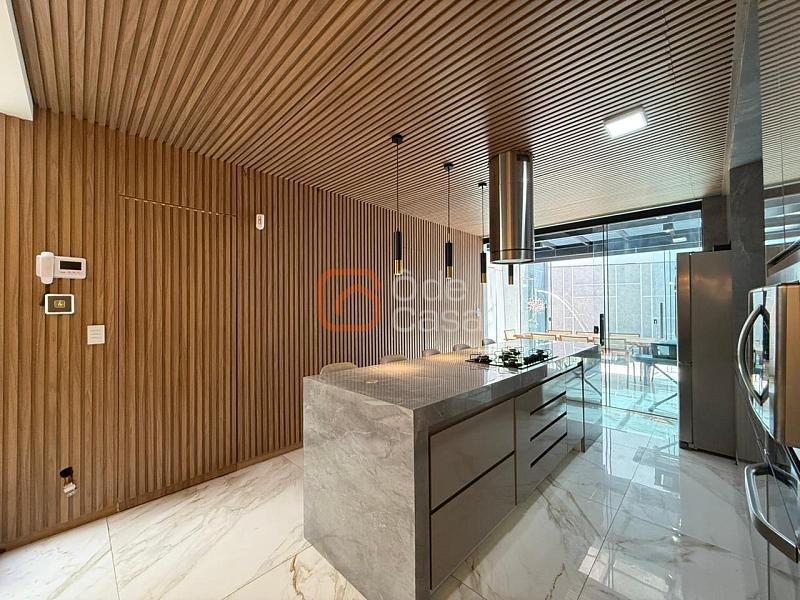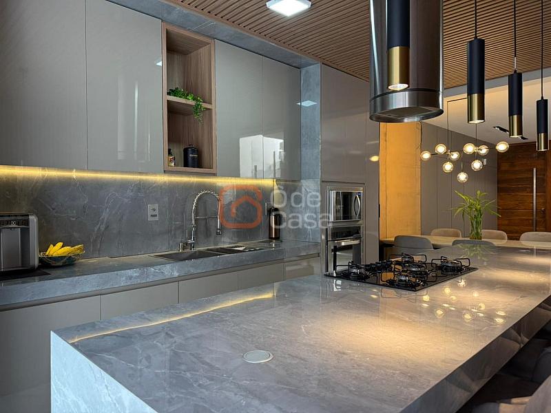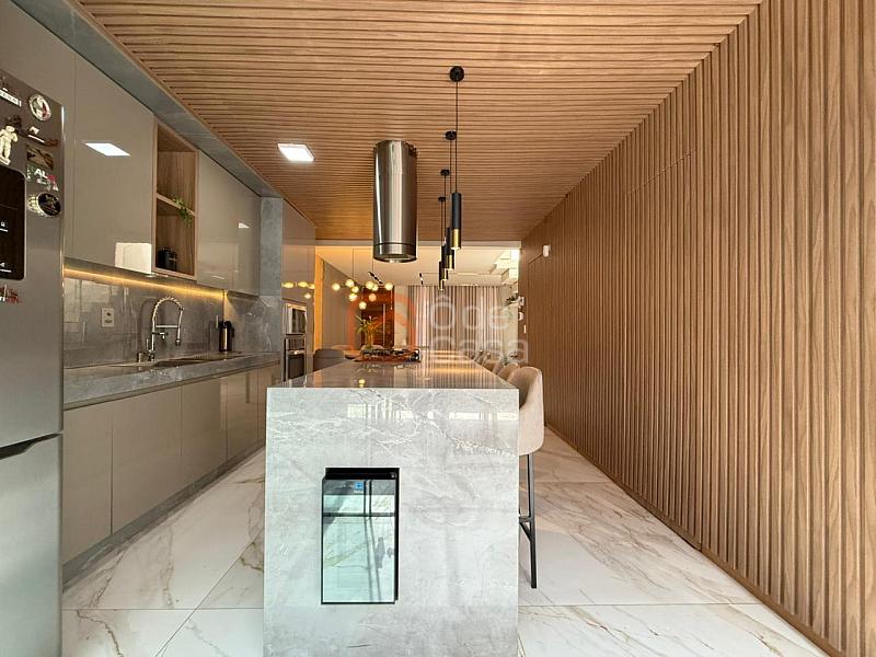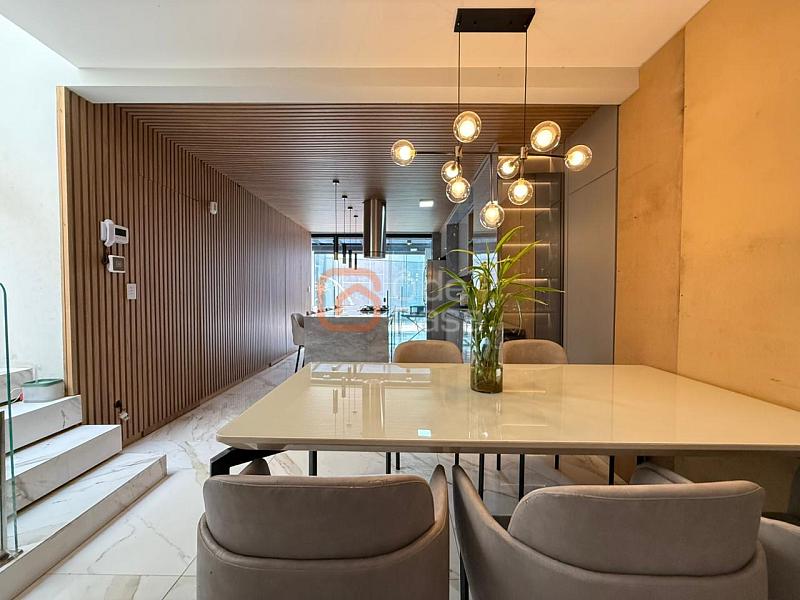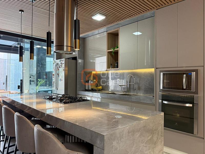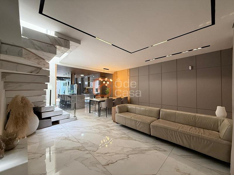 No primeiro pavimento, o living integrado une sala e cozinha com ilha central, armários planejados e eletrodomésticos embutidos, além de despensa, lavabo e área gourmet completa com churrasqueira. A área externa conta com piscina aquecida, hidromassagem e iluminação especial.