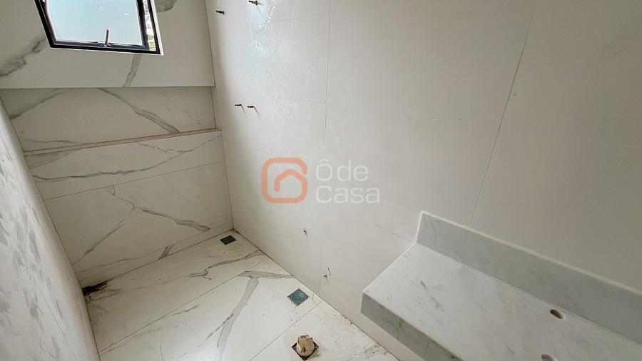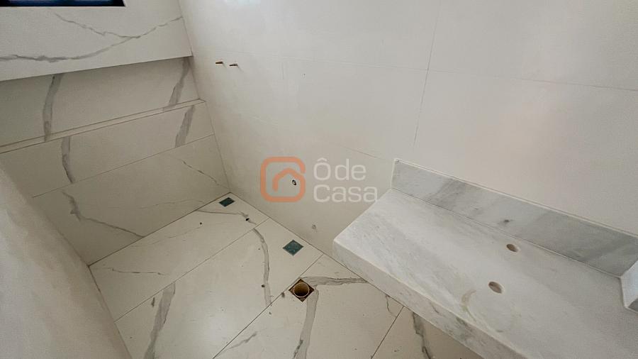 2º Pavimento: 3 quartos sendo 1 Suíte; Banheiro da suíte e o social com bancada em mármore, cuba da pia em apoio, nicho na área de banho, ambos com pré disposição para aquecimento solar