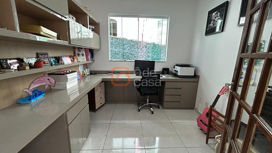 Casa plana em lote de 360m², estilo colonial e acabamento de alto padrão. Possui duas salas amplas, janelas com fechamento automático, três quartos (incluindo suíte com chuveiro duplo) e um escritório reversível para quarto. Cozinha planejada com cooktop, forno e coifa, além de área de serviço fechada. Afastamento lateral em todo o imóvel, com acesso rampado.