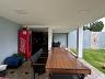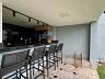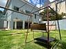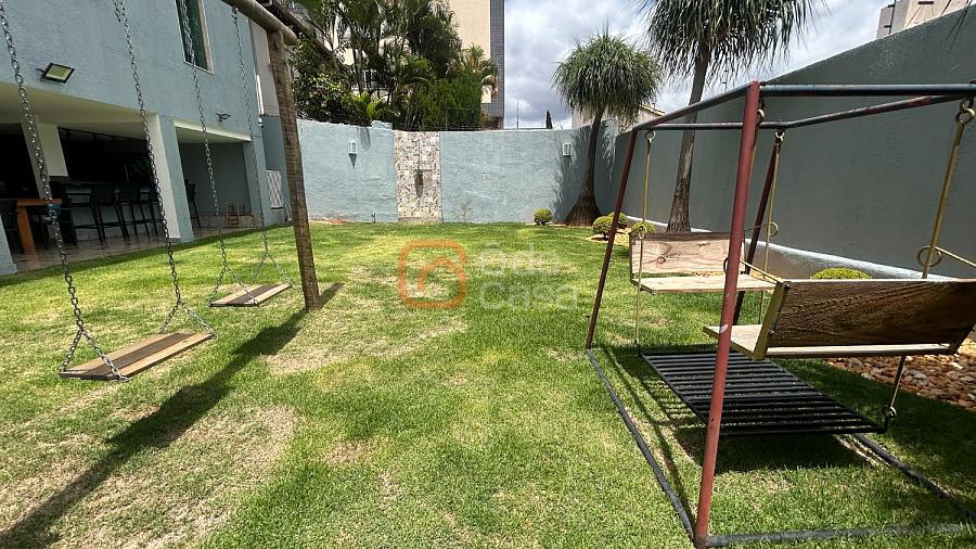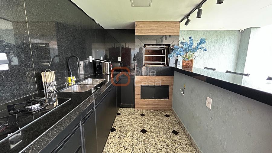 A área gourmet fica na parte inferior do terreno, oferecendo total privacidade, equipada com churrasqueira, cooktop, armários planejados e amplo quintal gramado com ducha — ideal para lazer.