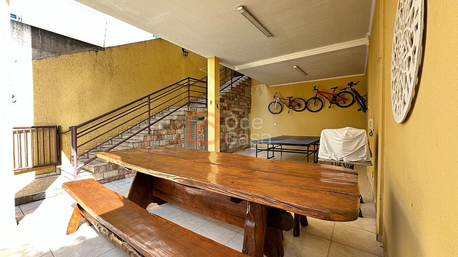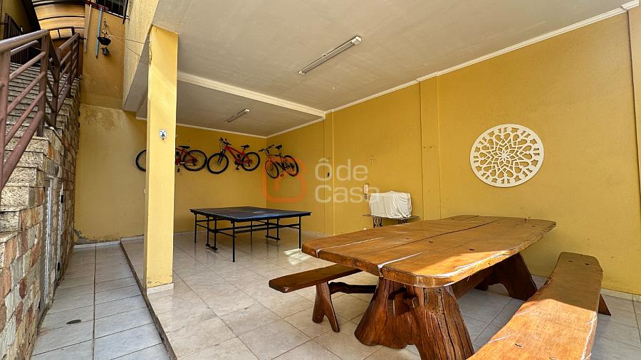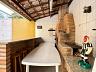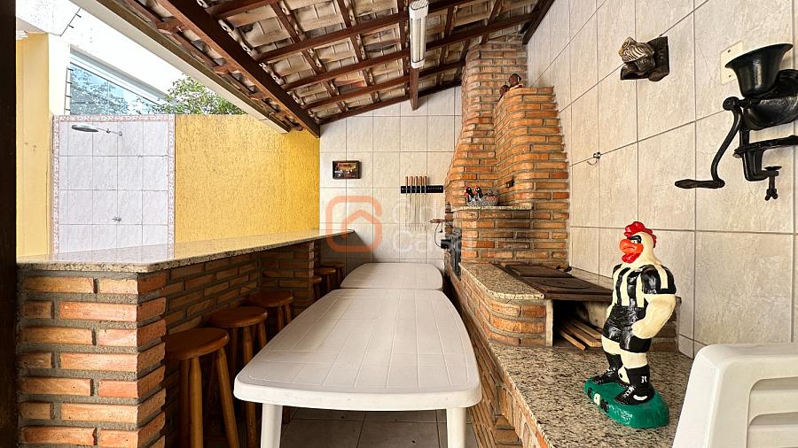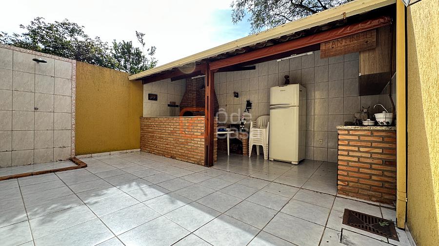 No quintal, um salão coberto com churrasqueira, fogão e forno à lenha, ducha, cozinha de apoio e armários — perfeito para reunir família e amigos.