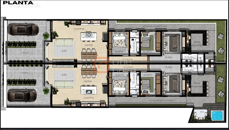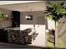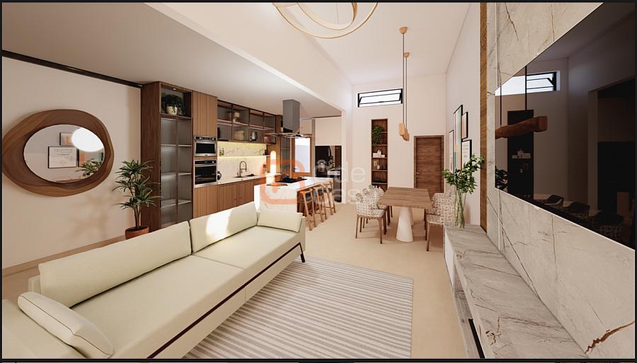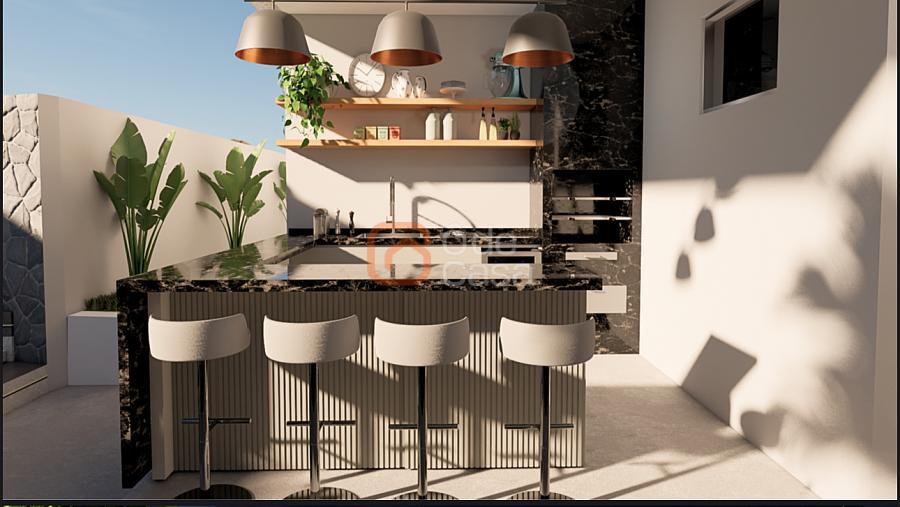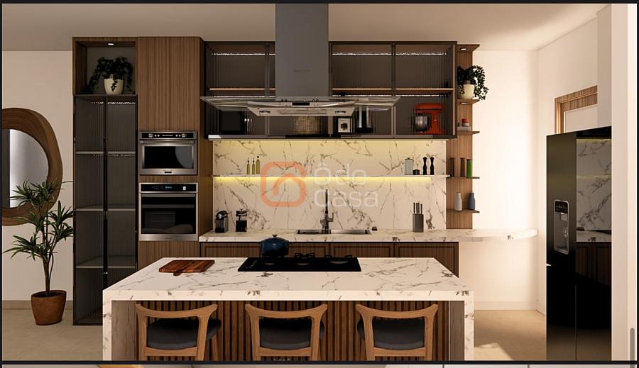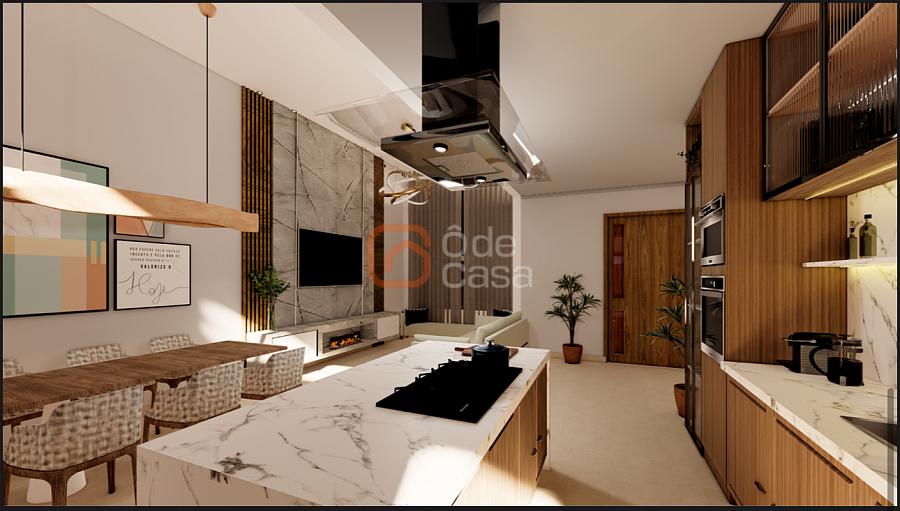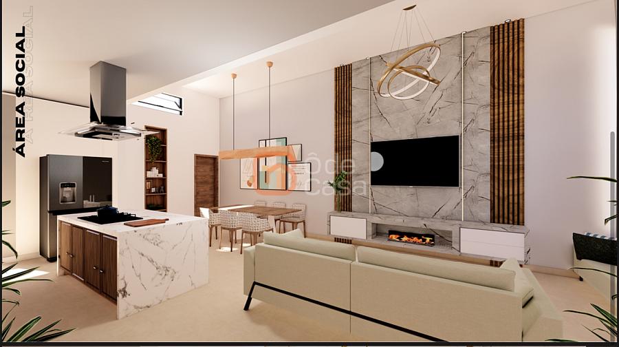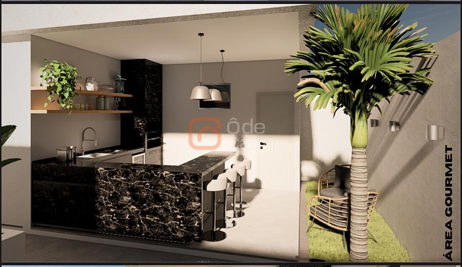 Ampla sala para 2 ambientes com pé direito alto integrada à cozinha americana com ilha, 3 quartos, sendo 1 suíte, banheiro social com acabamento de alto padrão, além de um corredor lateral com acesso ao quintal nos fundos, que conta com área gourmet.