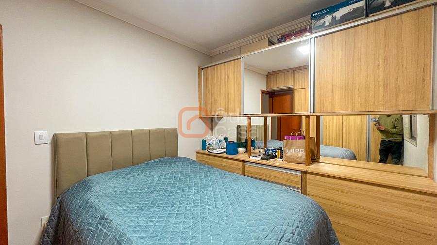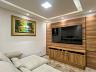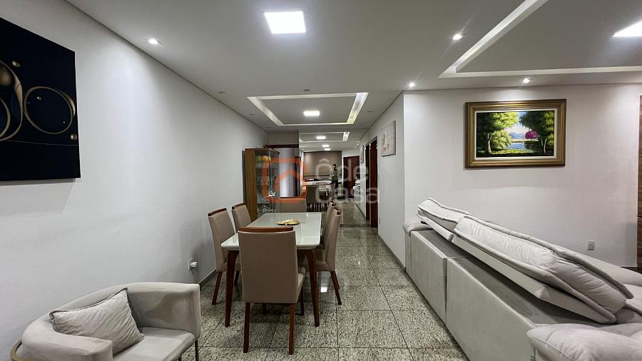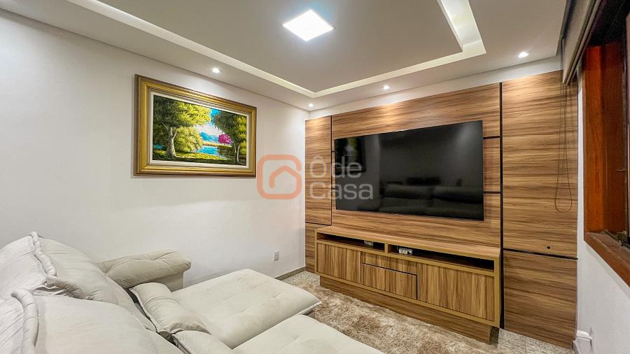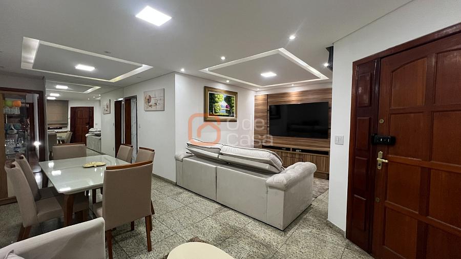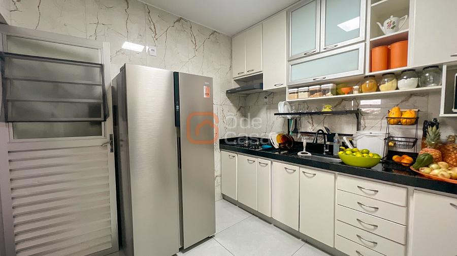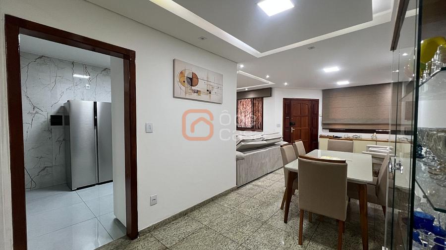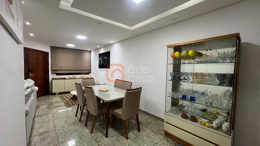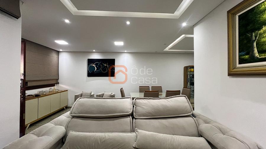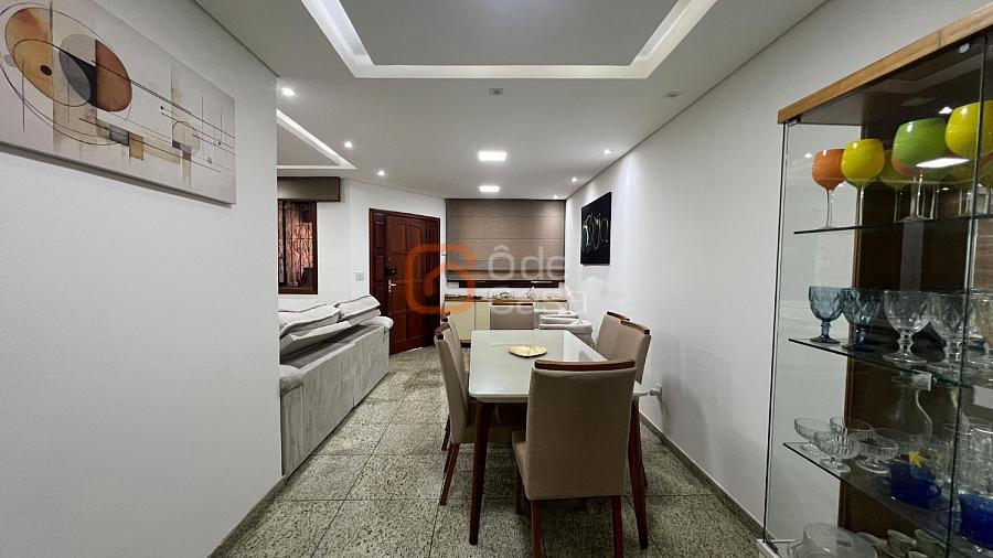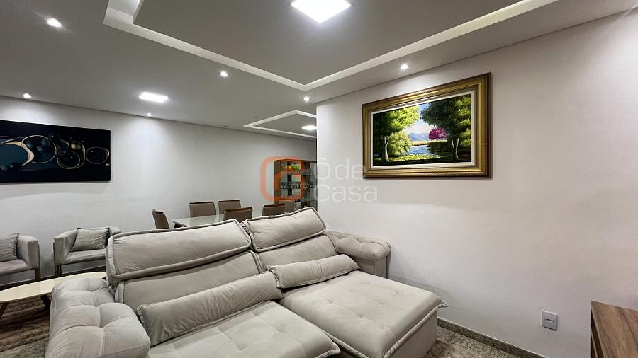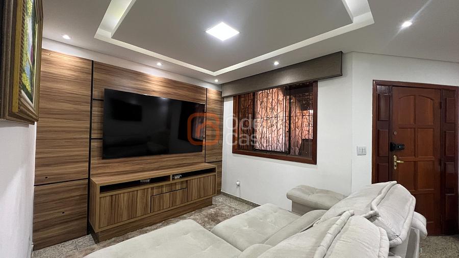 Sala para dois ambientes com rebaixamento em gesso e espelho decorativo, 3 quartos com armários planejados, sendo 1 suíte, banheiro social, cozinha recém-reformada com armários e área de serviço.