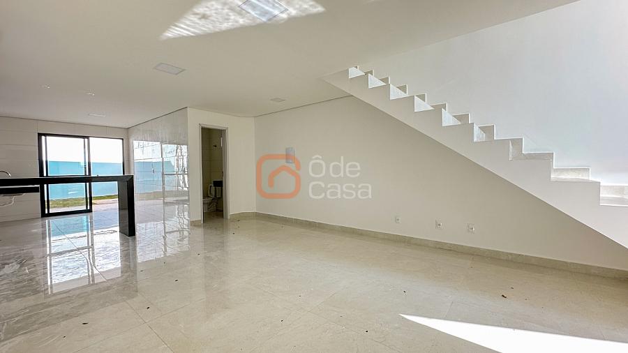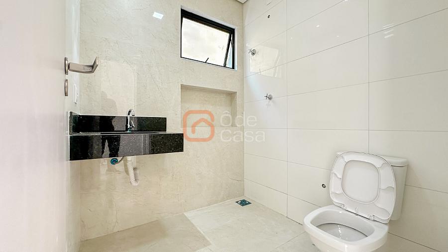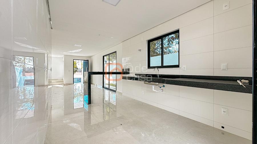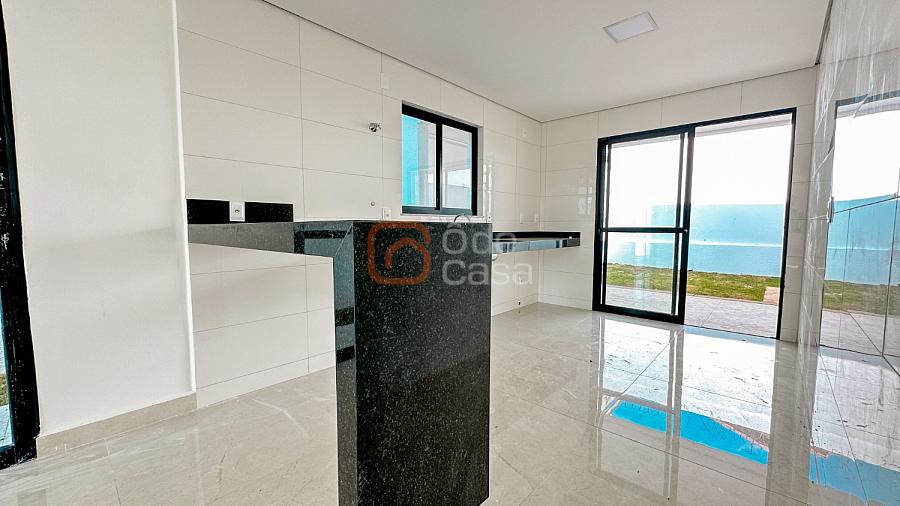 Afastamento frontal com garagem para até 4 veículos; corredor lateral com acesso ao quintal; sala de estar ampla com lavabo; cozinha americana com bancadas em granito; área gourmet coberta com churrasqueira e bancada e pia de apoio; lavanderia individual;