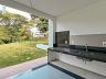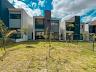 Área externa: parte coberta com cuba e bancada, podendo ser um espaço gourmet ou lavanderia e amplo quintal gramado descoberto. Horta orgânica individual na lateral da casa, com pergolado.