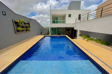 Ampla sala para 2 ambientes, cozinha com armários, 2 quartos, banheiro social, área externa com churrasqueira e área de serviço.