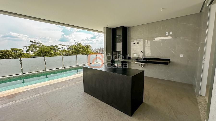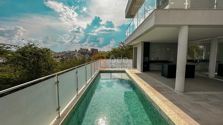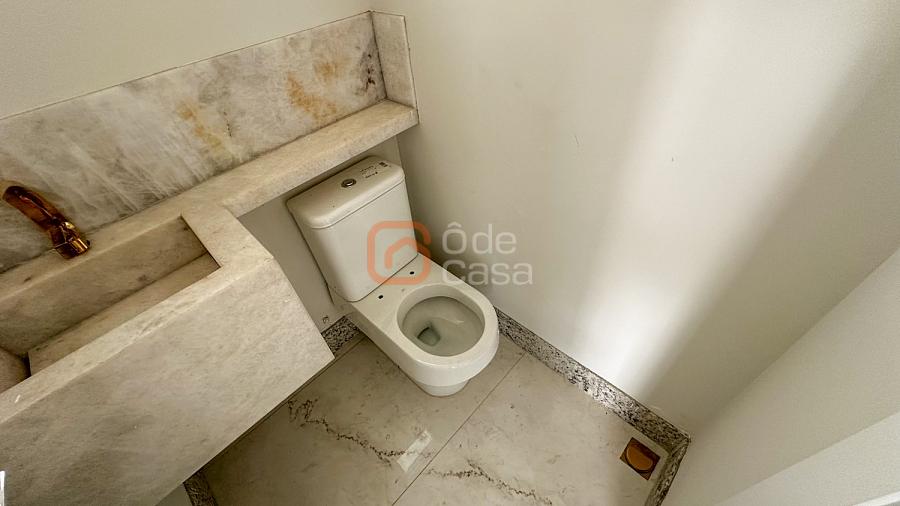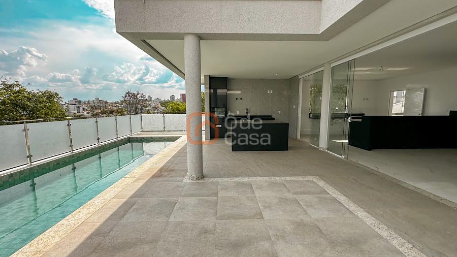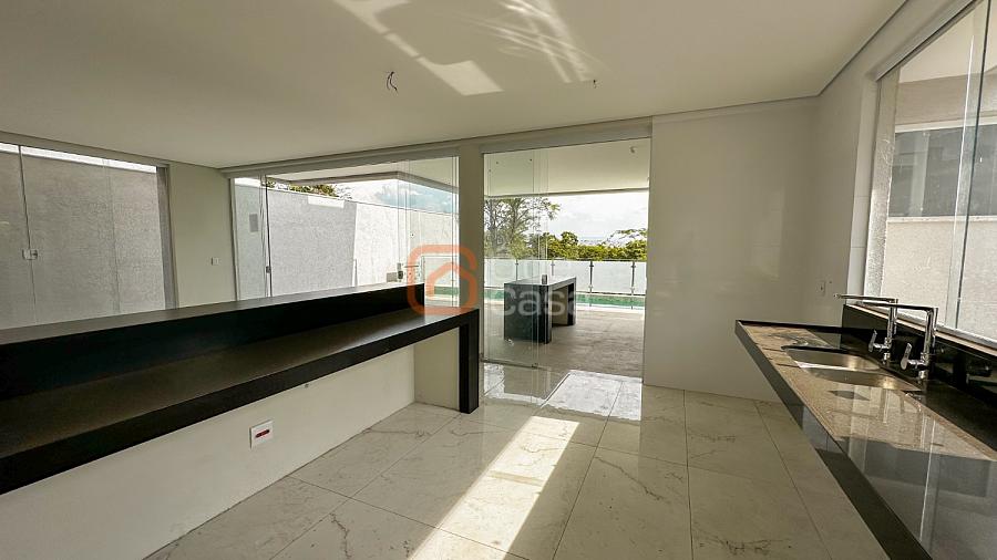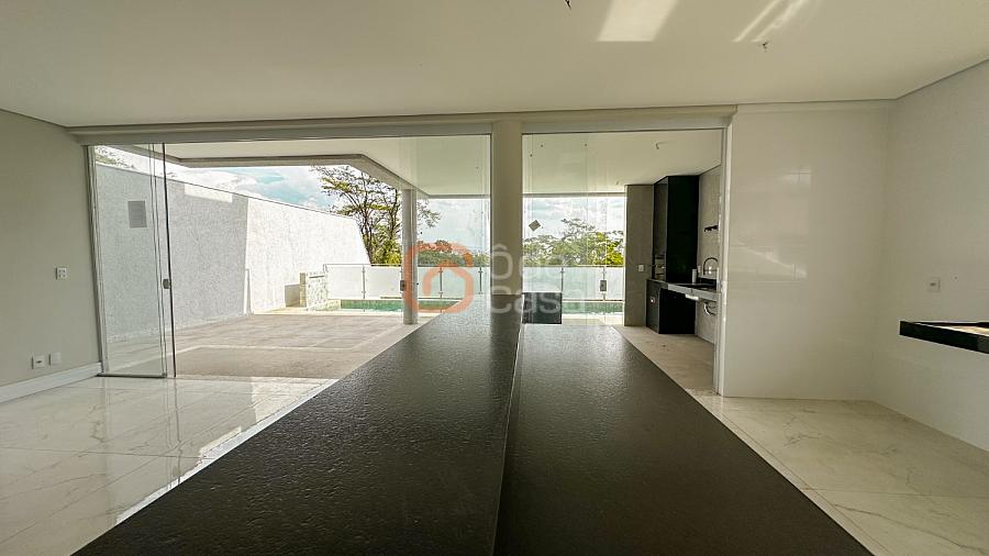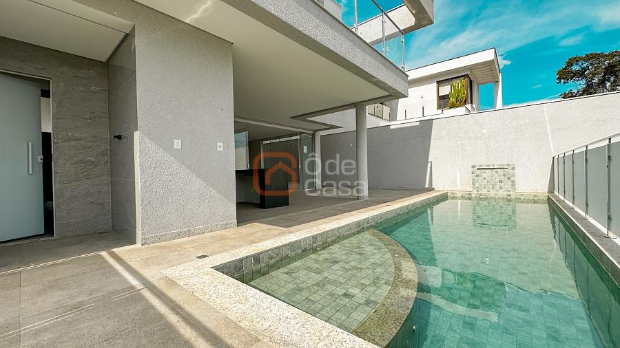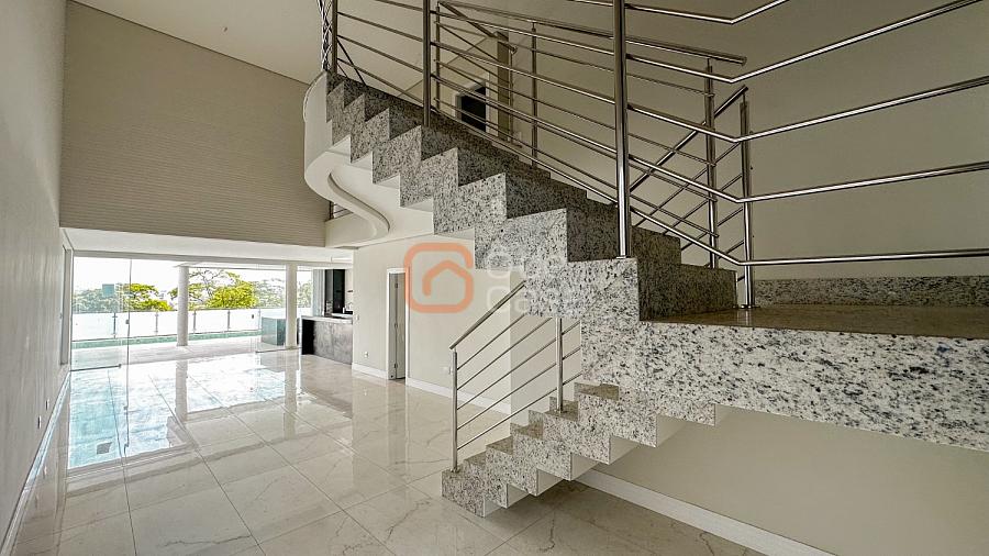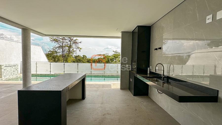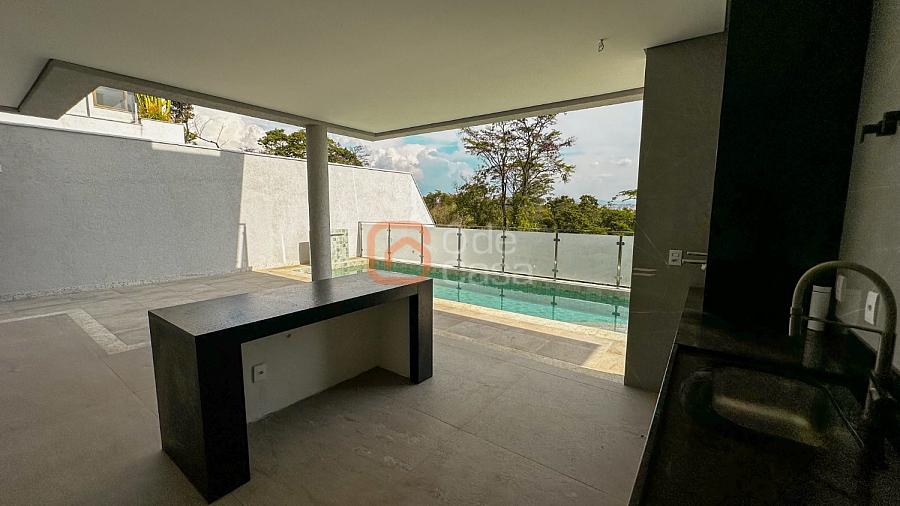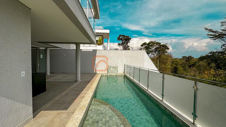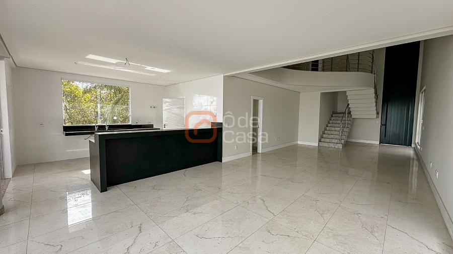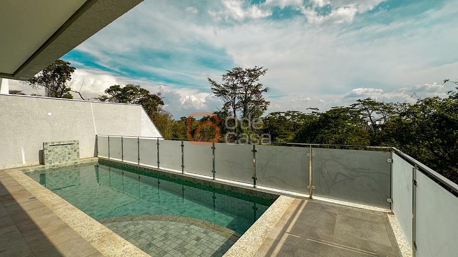 1° Pavimento: Porta com 6m² de altura, sala com pé direito duplo, lavabo, cozinha americanA integrada com área gourmet, piscina e cascata. Banheiro social com acessibilidade. Área de serviço, despensa, e DCE completo.