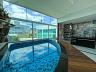 Área de lazer: escada para acesso a área de lazer, piscina aquecida, churrasqueira, sauna (finalizando), pergolado com amplo terraço.