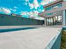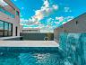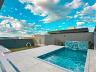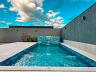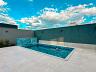 Área externa: espaço gourmet com churrasqueira, piscina com cascata e lavabo.