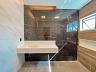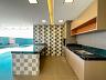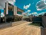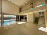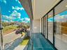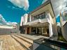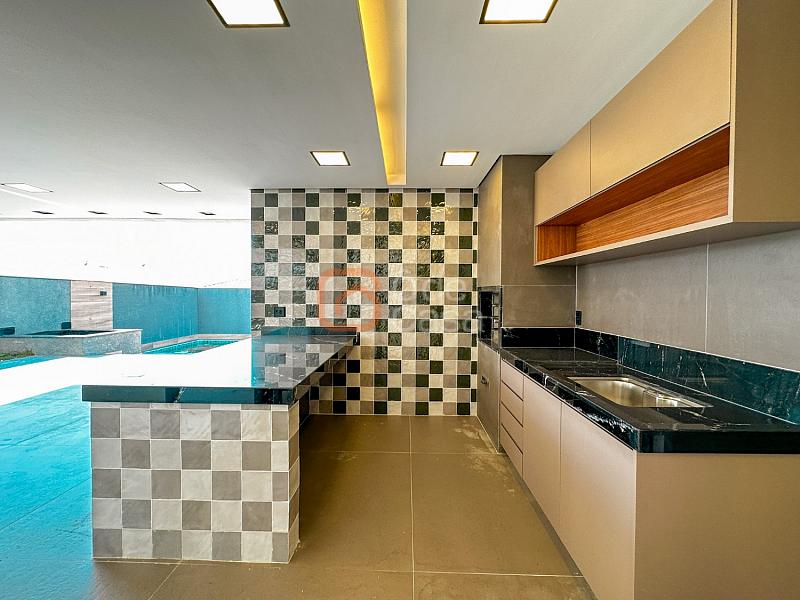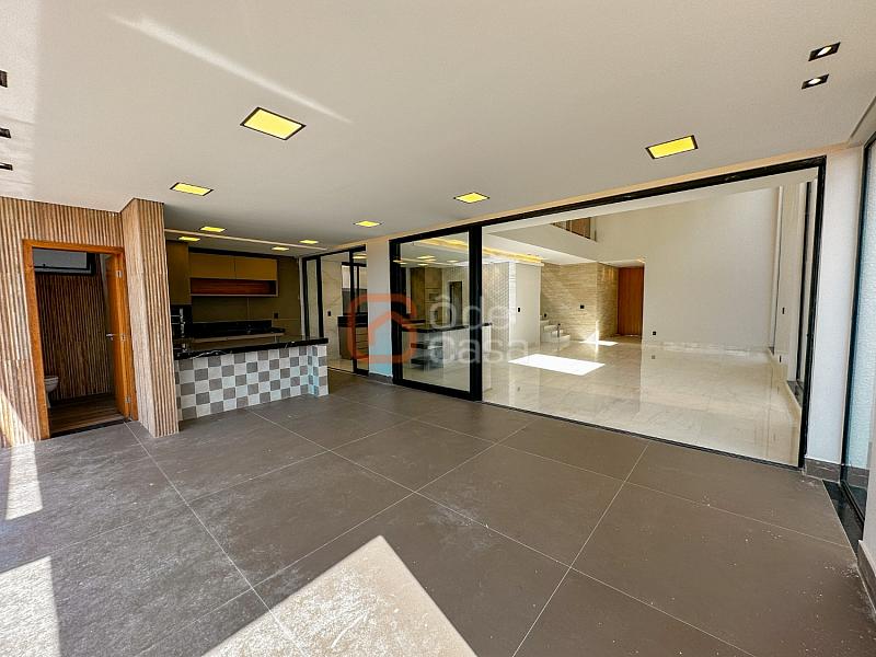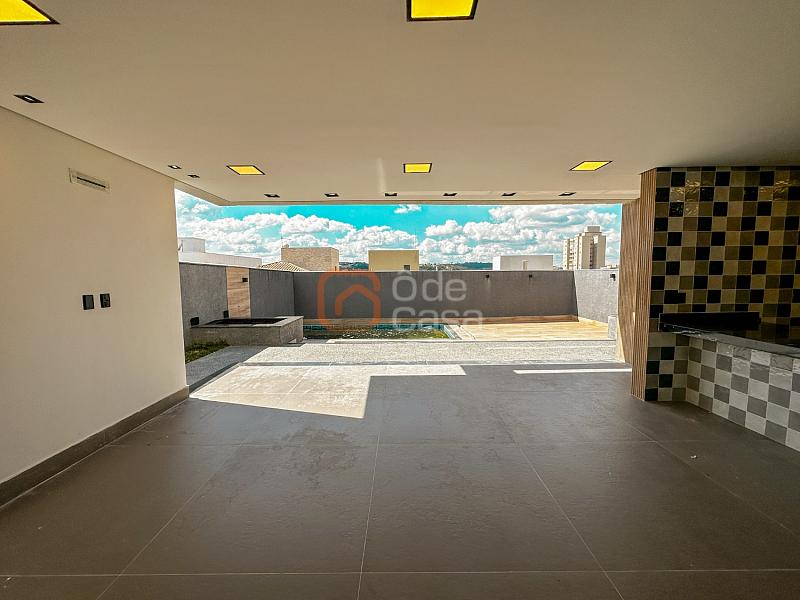 1° Pavimento: Sala de estar com pé direito duplo, cozinha americana, espaço gourmet com churrasqueira, lavabo, piscina com cascata, spa e ducha.