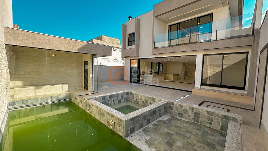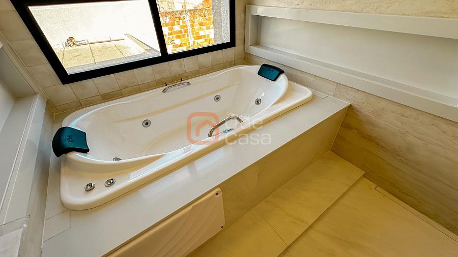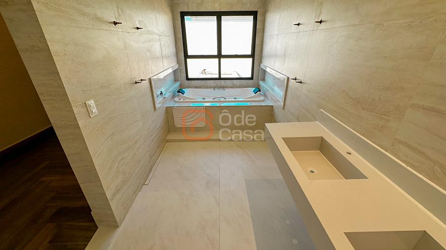 Ao fundo, uma ampla suíte do casal com varanda em L, closet, banheiro com dupla cuba, dupla ducha e hidromassagem com vista para a área de piscina.
