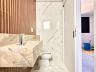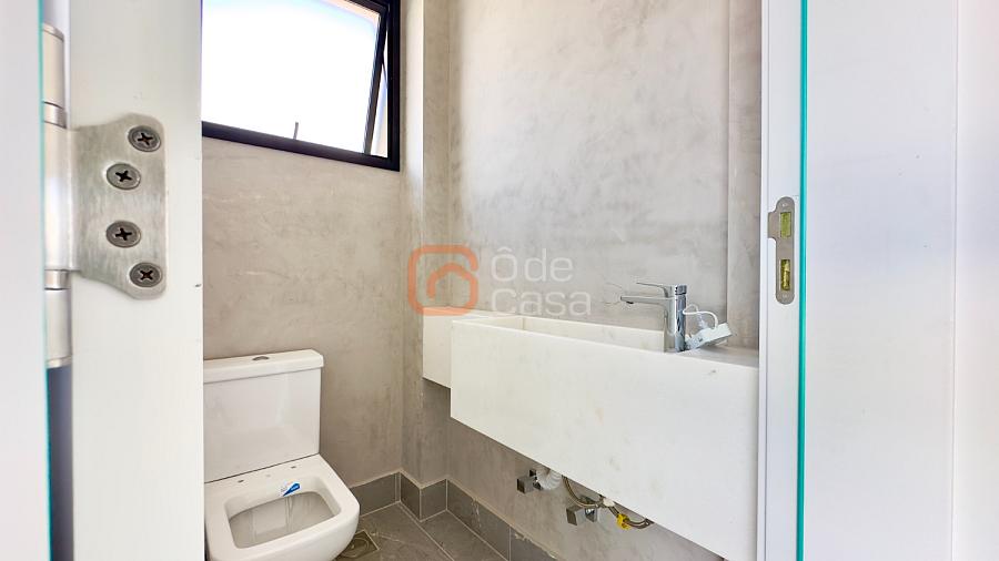 Com 166m², o primeiro pavimento conta com sala de estar integrada à cozinha americana, três quartos, sendo uma suíte, e banho social. Todo o projeto preparado para água quente em torneiras e chuveiros.