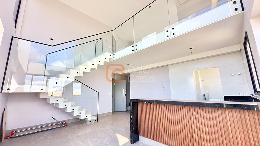 No segundo pavimento, sala com pé-direito duplo, área externa com espaço gourmet e lavabo de apoio. Destaque para a vista definitiva e excelente entrada de luz natural.