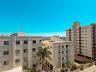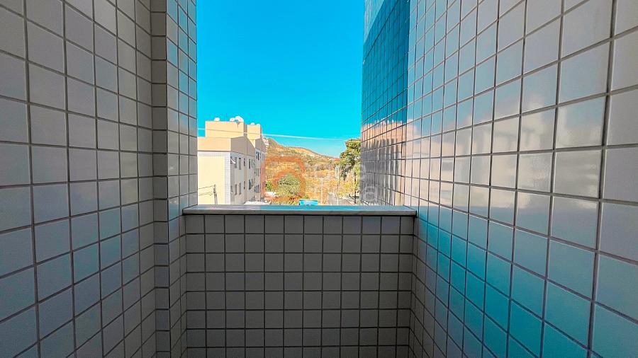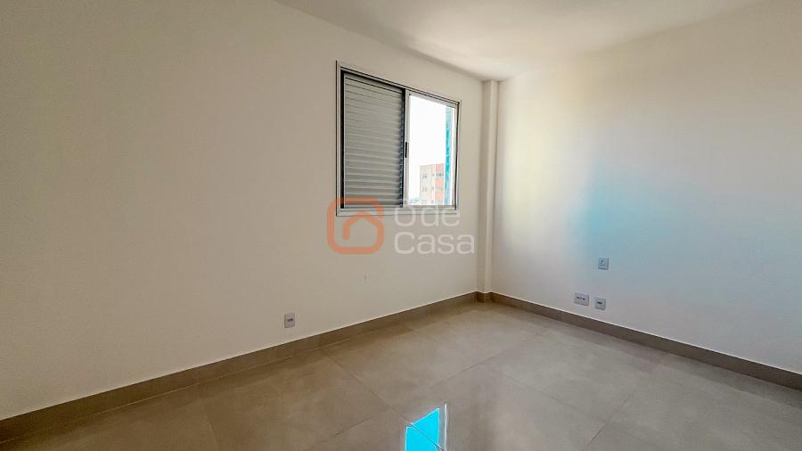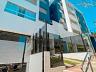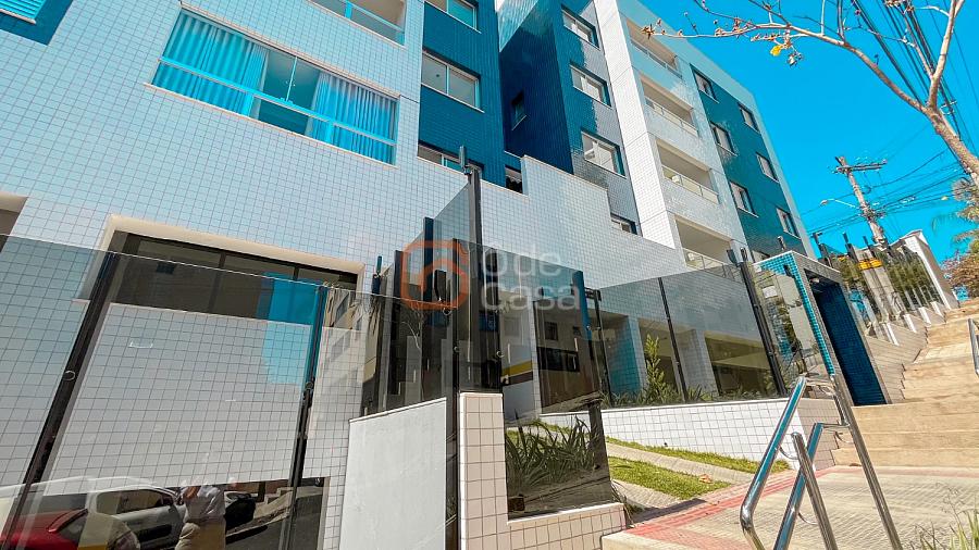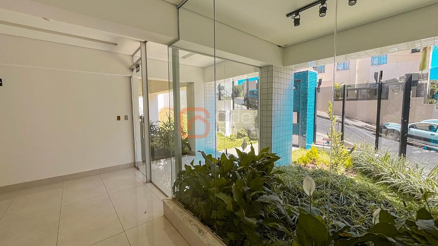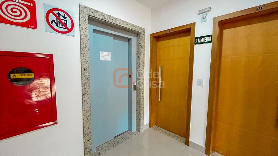 Prédio novo e revestido, com elevador, hall de entrada e garagem sob pilotis.