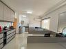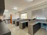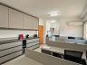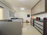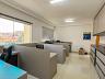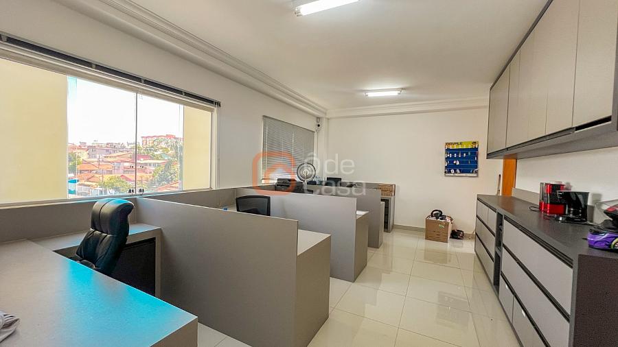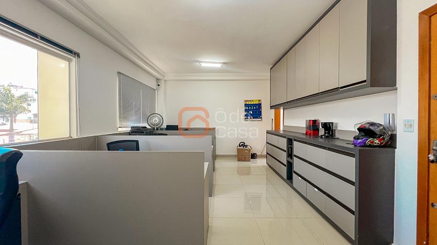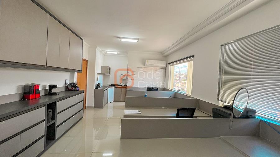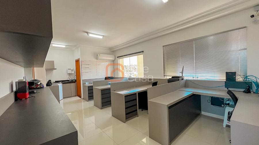 Ampla sala comercial mobiliada com armários, mesas, ar condicionado, frigobar, micro-ondas, purificador de água, cozinha com banheiro e quarto de despensa.